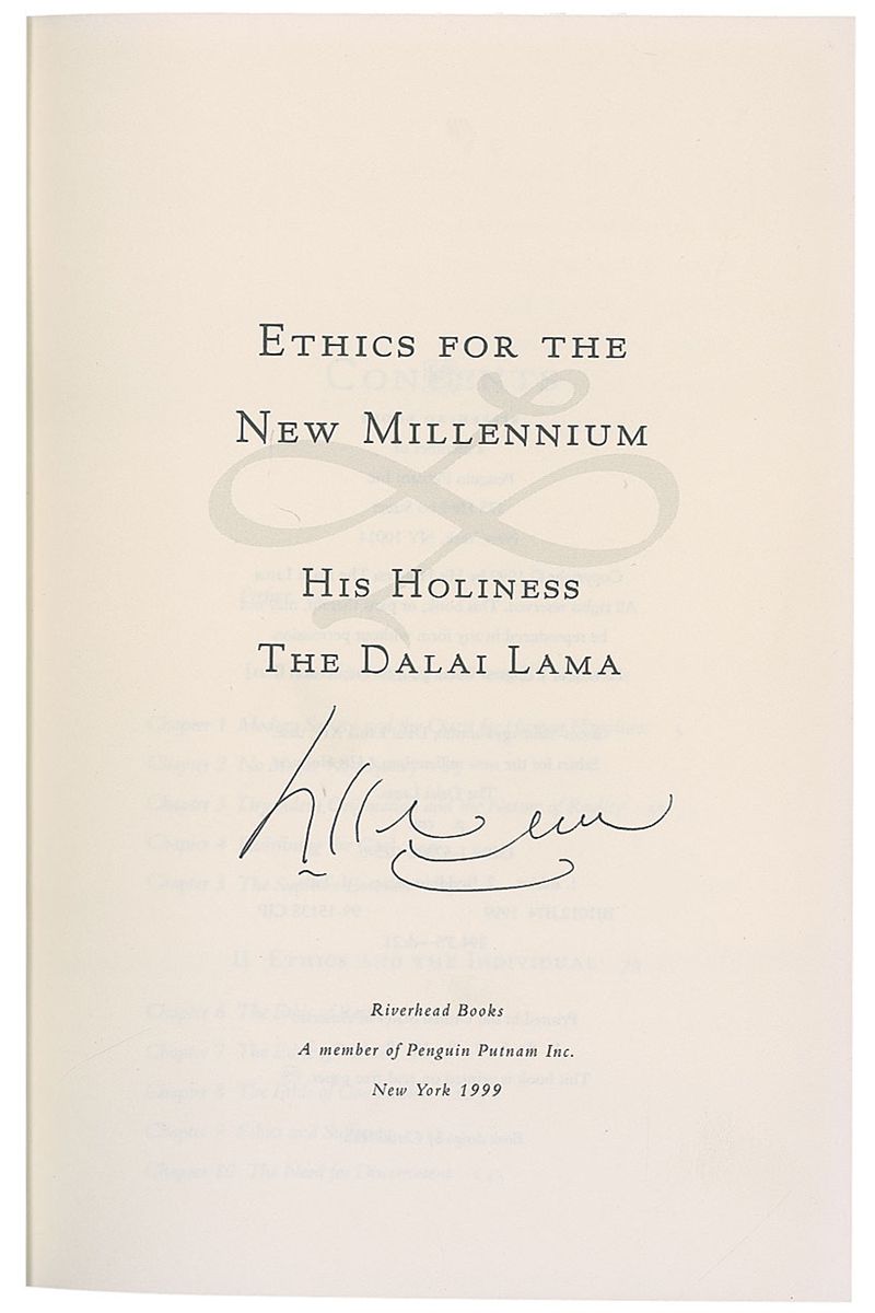 Signed book: Ethics for the New Millennium. First edition, first printing. NY: Riverhead Books, 1999. Hardcover with dust jacket, 6.25 x 9.25, 237 pages. Signed on the title page in black ink. In fine condition, with some light rubbing to dust jacket.
