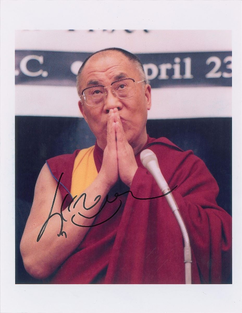 Wonderful color glossy 8.5 x 11 photo of the Dalai Lama with his hands pressed together in prayer during a conference, signed in black felt tip. In fine condition.
