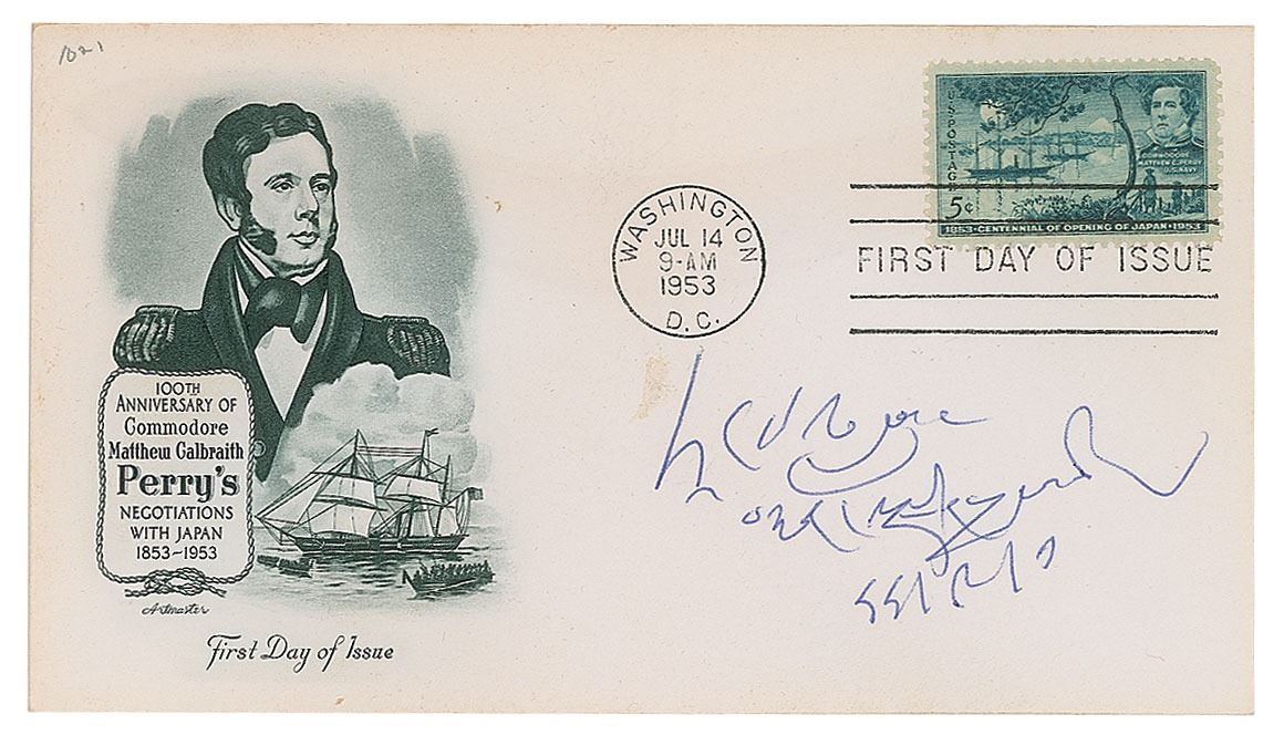 FDC with a cachet honoring the 100th anniversary of Commodore Matthew C. Perry's negotiations with Japan, signed in blue ballpoint by the Dalai Lama. In fine condition.