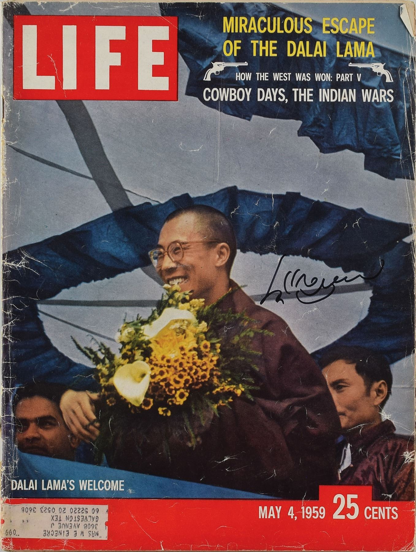 Issue of Life Magazine from May 4, 1959, covering the Dalai Lama's escape from Tibet, 154 pages, 10.5 x 14, signed on the front cover in black felt tip by the Dalai Lama. In very good condition, with scattered wear and creasing (especially to edges), and a few small tears to the spine. Accompanied by a full letter of authenticity from JSA.