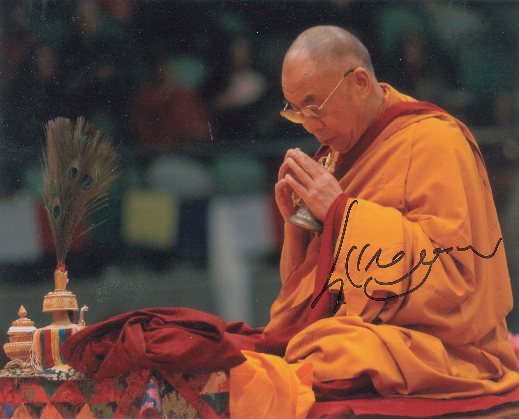 Appealing color glossy 10 x 8 full-length photo of the Dalai Lama seated in prayer, signed in Tibetan in black felt tip. In fine condition. Accompanied by the original mailing envelope from the Office of His Holiness the Dalai Lama.