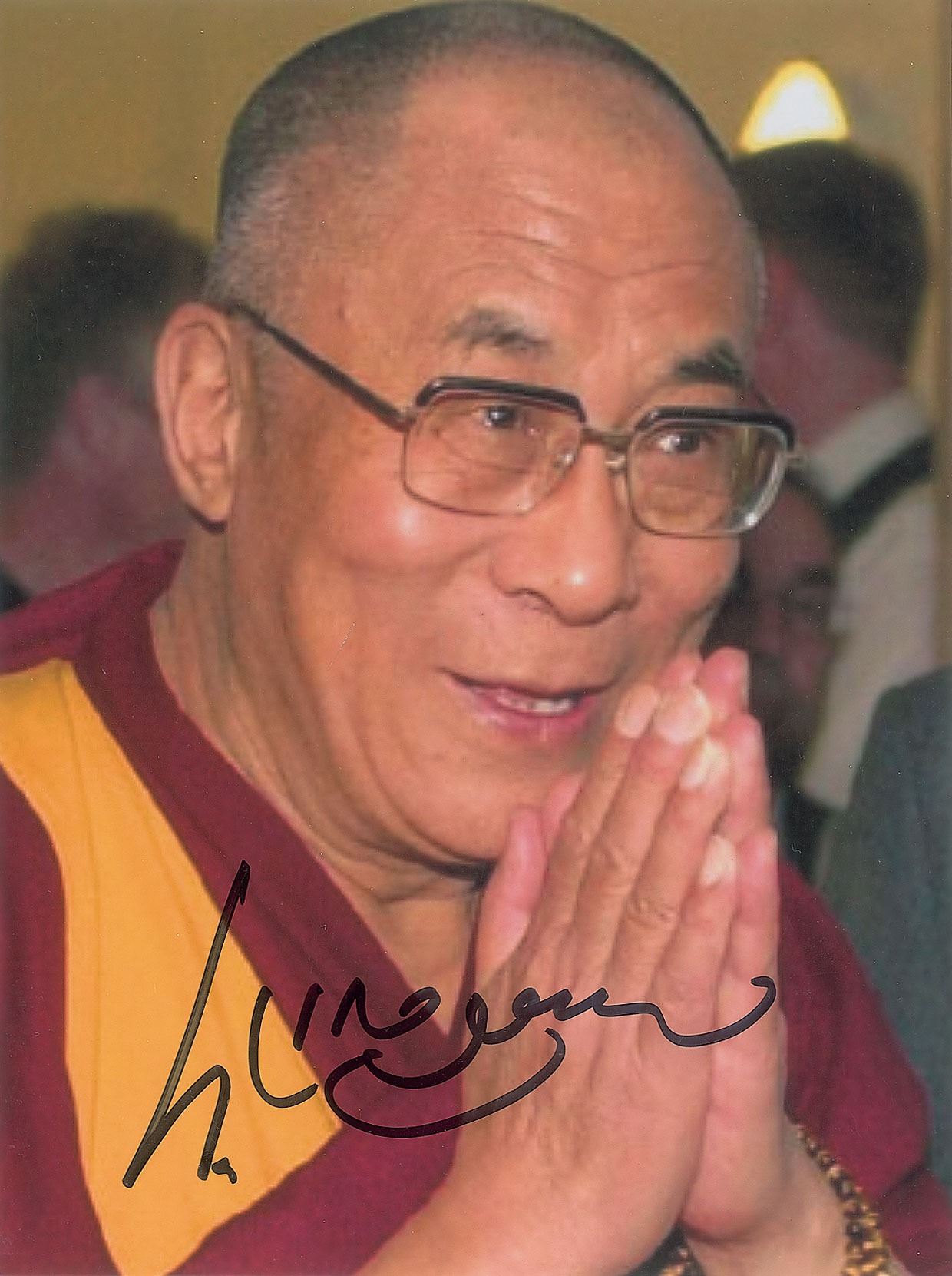 Color glossy 5 x 6.5 photo of Dalai Lama in his robes, signed in black felt tip. In fine condition.