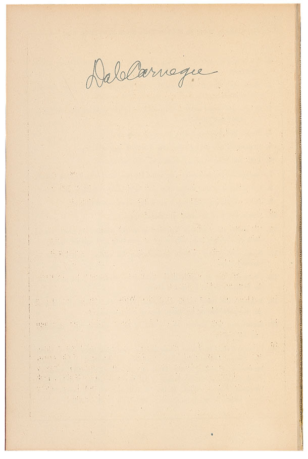 Signed book: How to Stop Worrying and Start Living. First printing. New York: Simon & Schuster, 1948. Hardcover, 5.5 x 8.5, 306 pages. Signed in fountain pen opposite the first free end page. In very good condition, with partial separation of the first page along the spine, light uniform toning, and mild staining and soiling to the front and back boards.