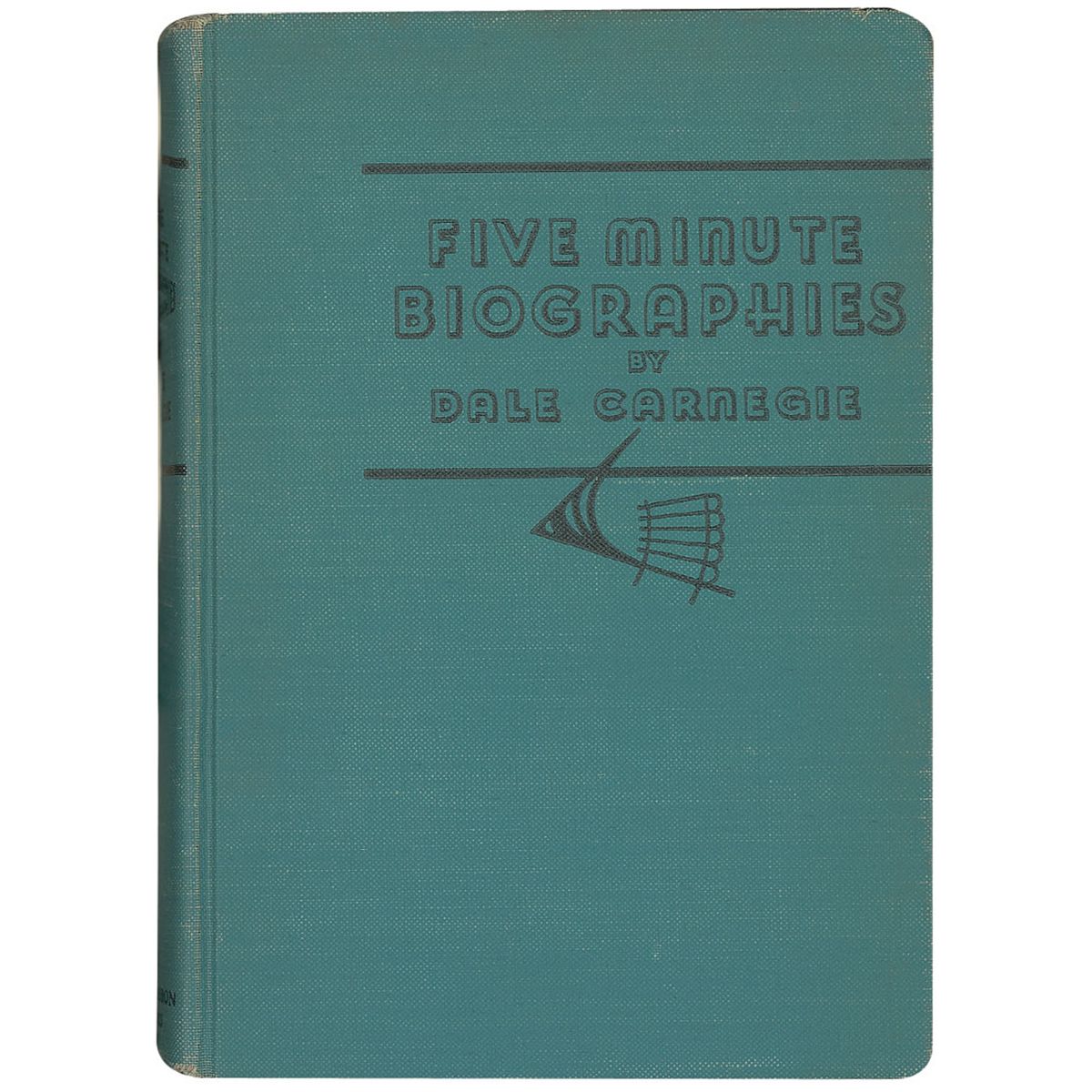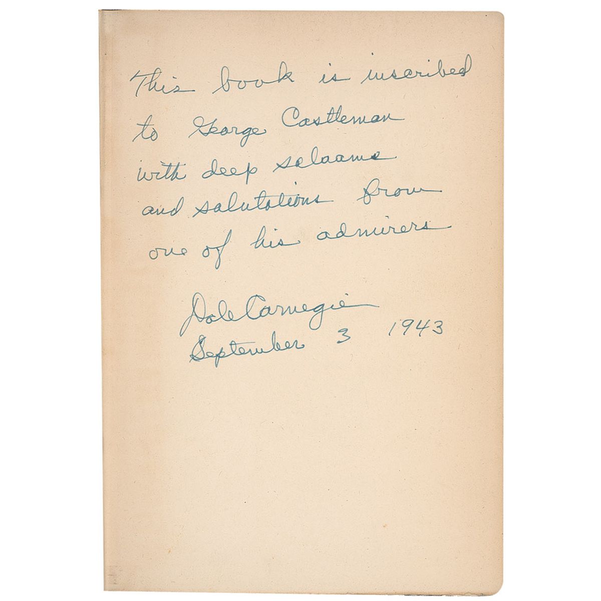 Author and lecturer (1888–1955) whose motivational book How to Win Friends and Influence People became one of the best-selling nonfiction works of modern times. Signed book: Five Minute Biographies. Later printing. NY: Blue Ribbon Books, 1940. Hardcover, 5.75 x 8, 256 pages. signed and inscribed in fountain pen on the first free end page, “This book is inscribed to George Castleman with deep salaams and salutations from one of his admirers, Dale Carnegie, September 3, 1943.” In very good condition, with uniform toning to the signature page and text block, some scattered soiling to the loose, but intact, hinge, and moderate wear to the cover, with some tears at the head and tail of the spine.