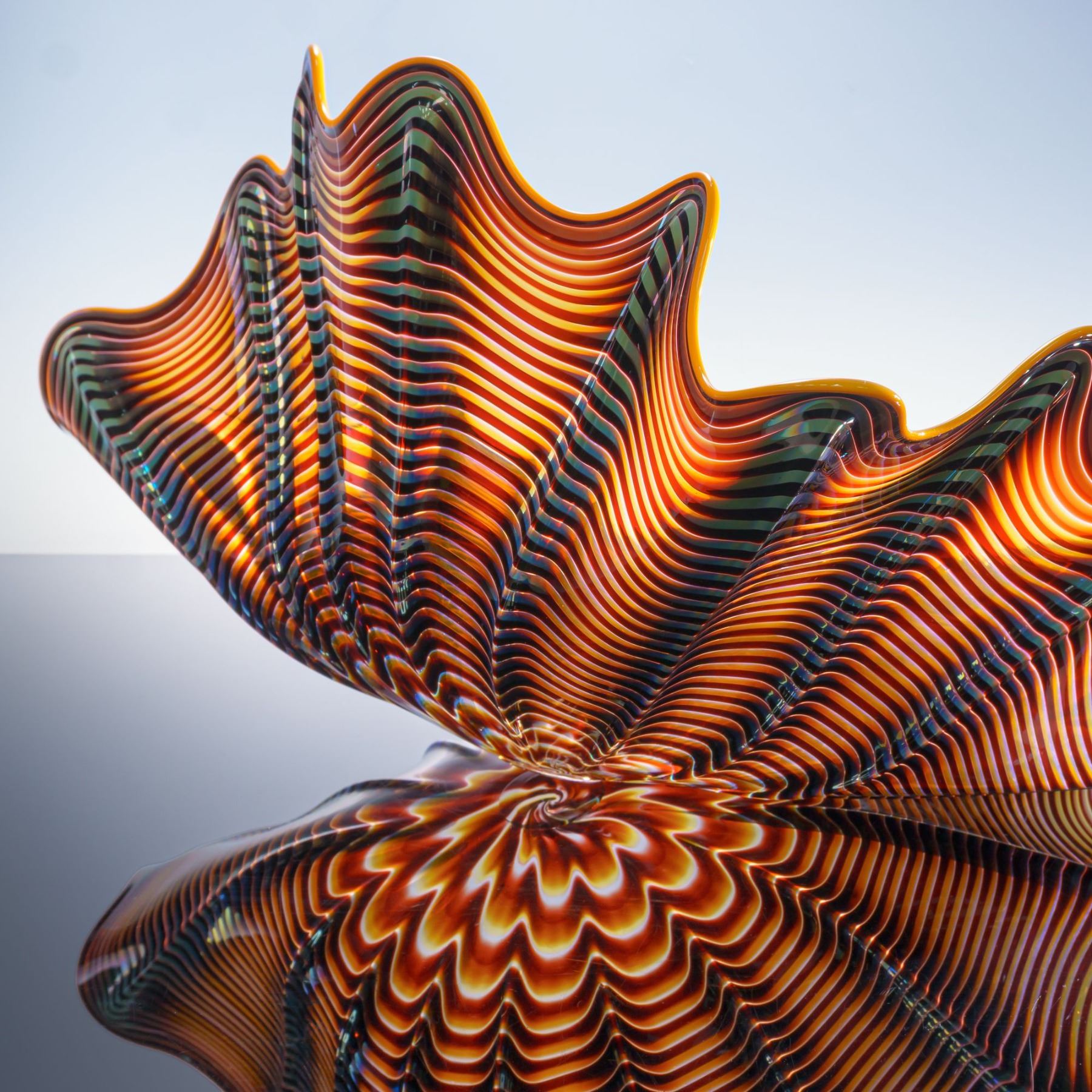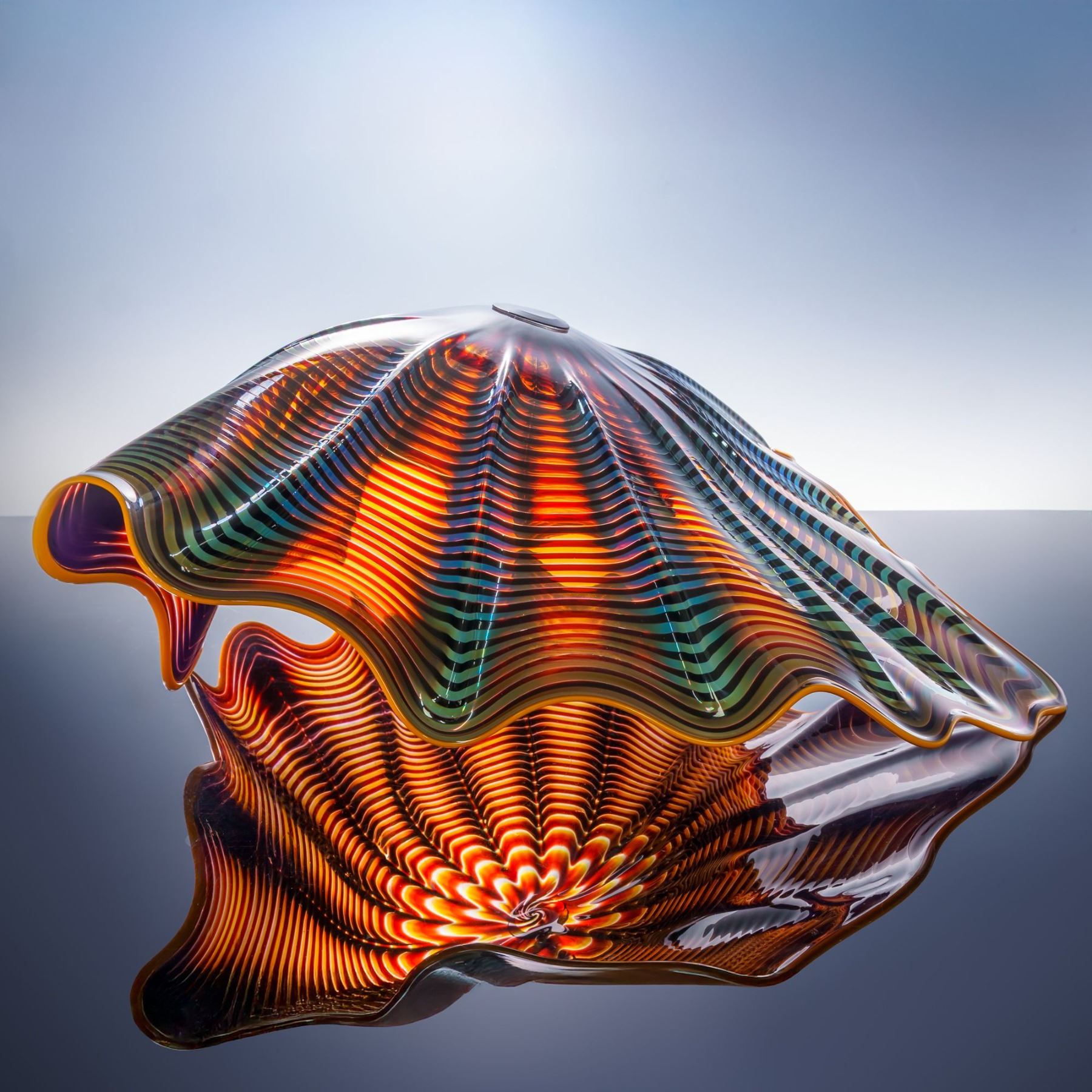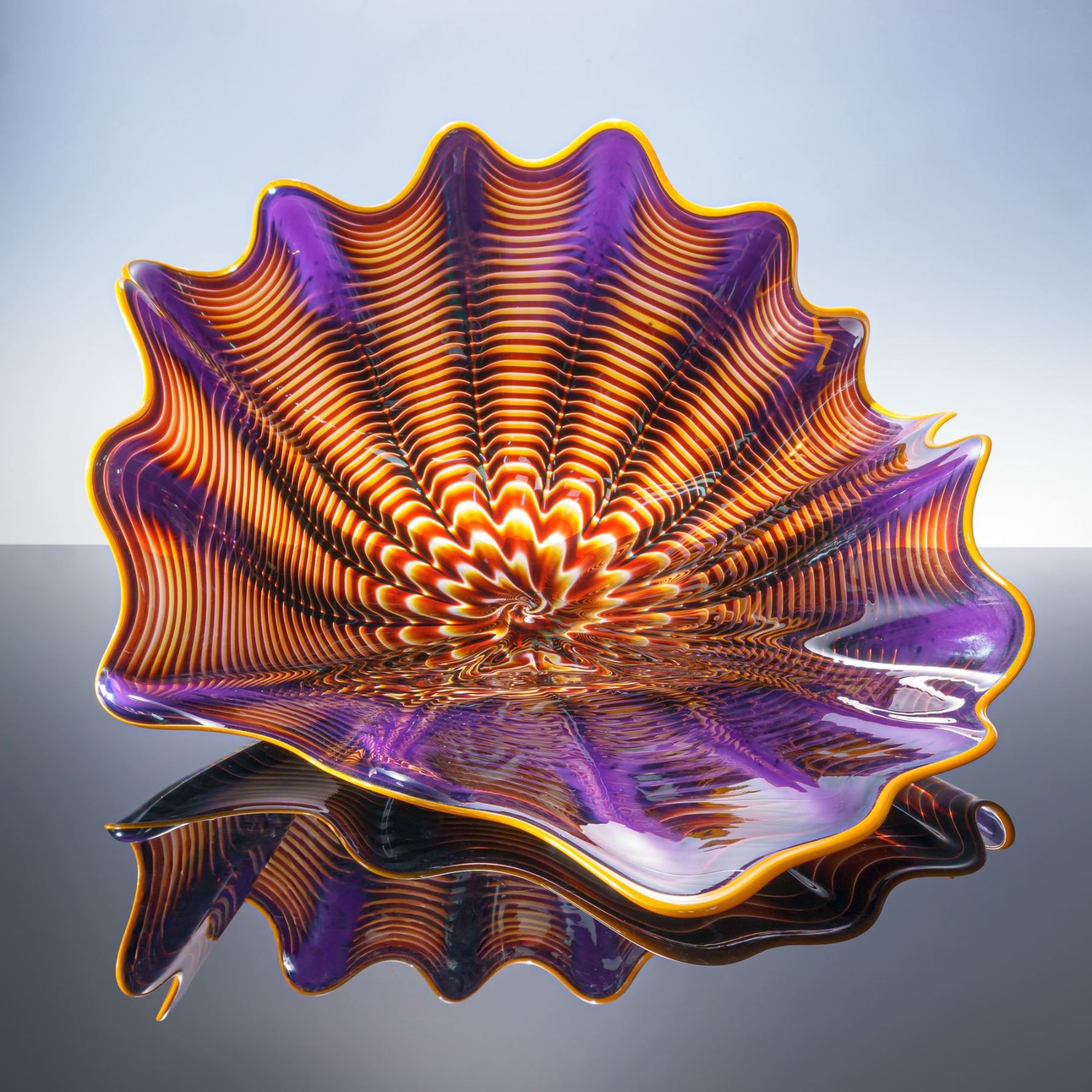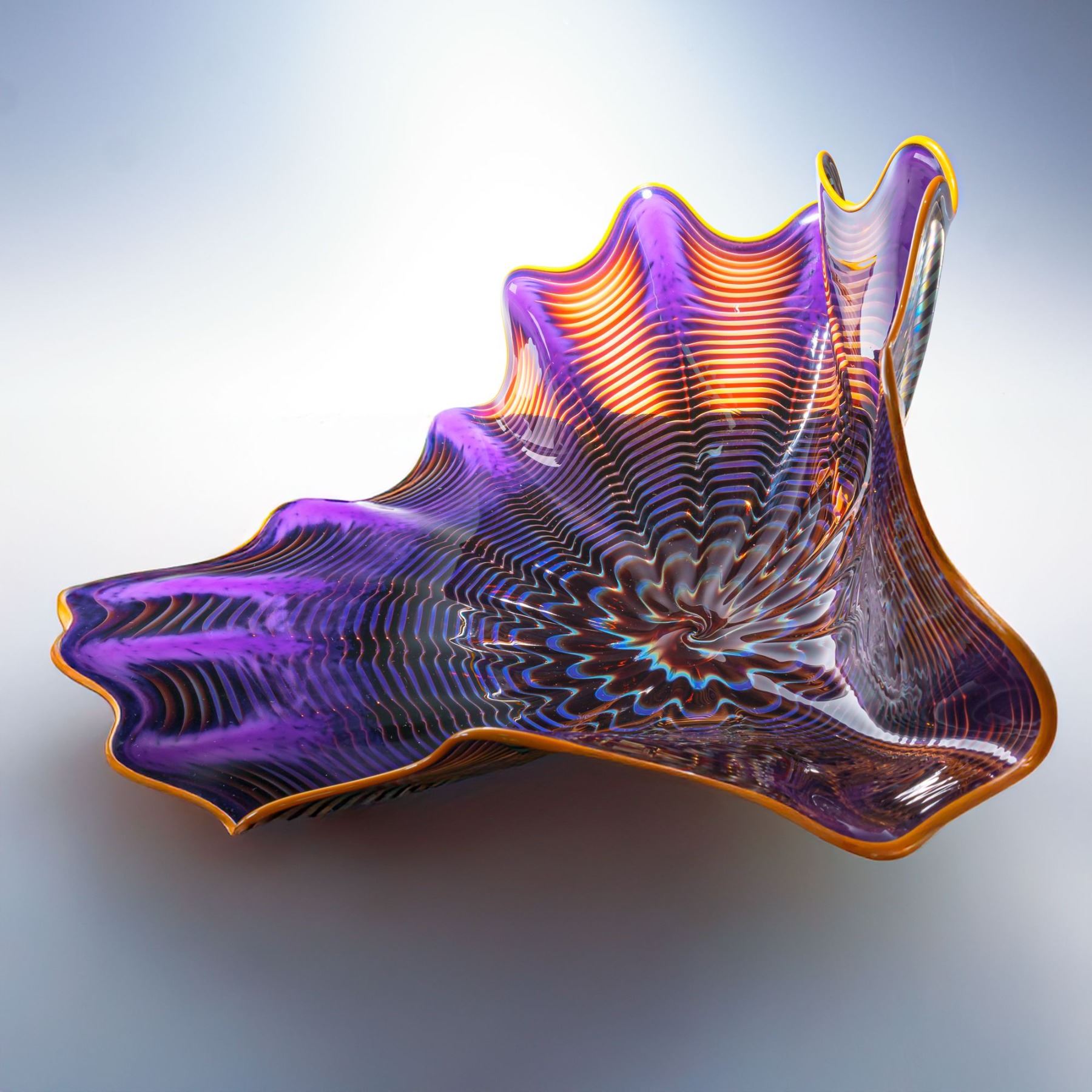 An extraordinary 2-piece Persian set by renowned American glass artist Dale Chihuly, celebrated for revolutionizing the art of contemporary glass. This vibrant pair exemplifies Chihuly's mastery of organic form and radiant color. Each undulating shell-like form displays mesmerizing striations of violet, amber, crimson, and gold, highlighted by fluid, rippling edges that evoke the rhythm of the sea. The luminous interplay of light within the glass reveals remarkable depth and motion, a hallmark of Chihuly's celebrated Persians series. Born in Tacoma, Washington, Dale Chihuly is internationally acclaimed for elevating glass to the realm of fine art. His pioneering techniques and large-scale installations, such as those exhibited at the Venetian, the Bellagio, and the Victoria and Albert Museum, have made him one of the most influential figures in modern glass sculpture. A breathtaking example of Chihuly's dynamic artistry, capturing the essence of color, form, and light in timeless sculptural harmony.