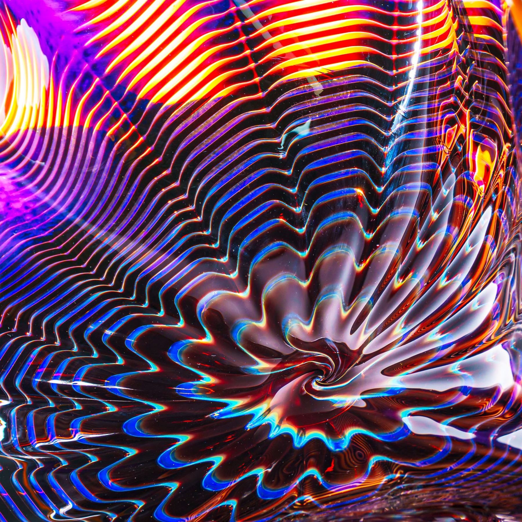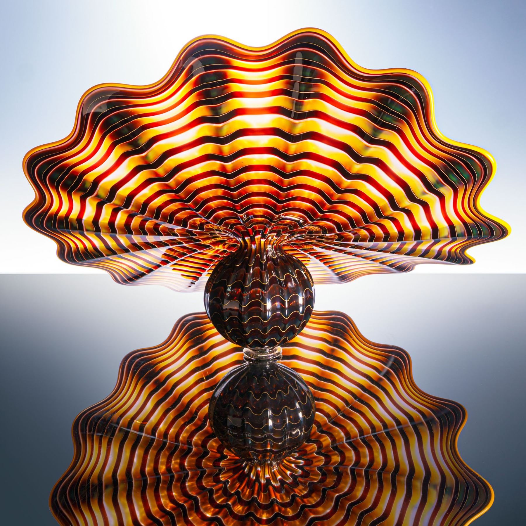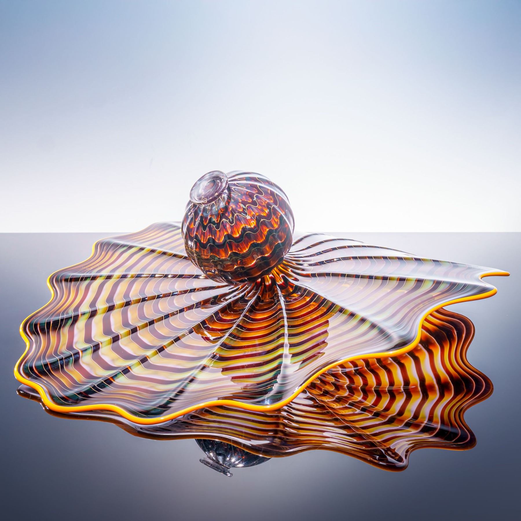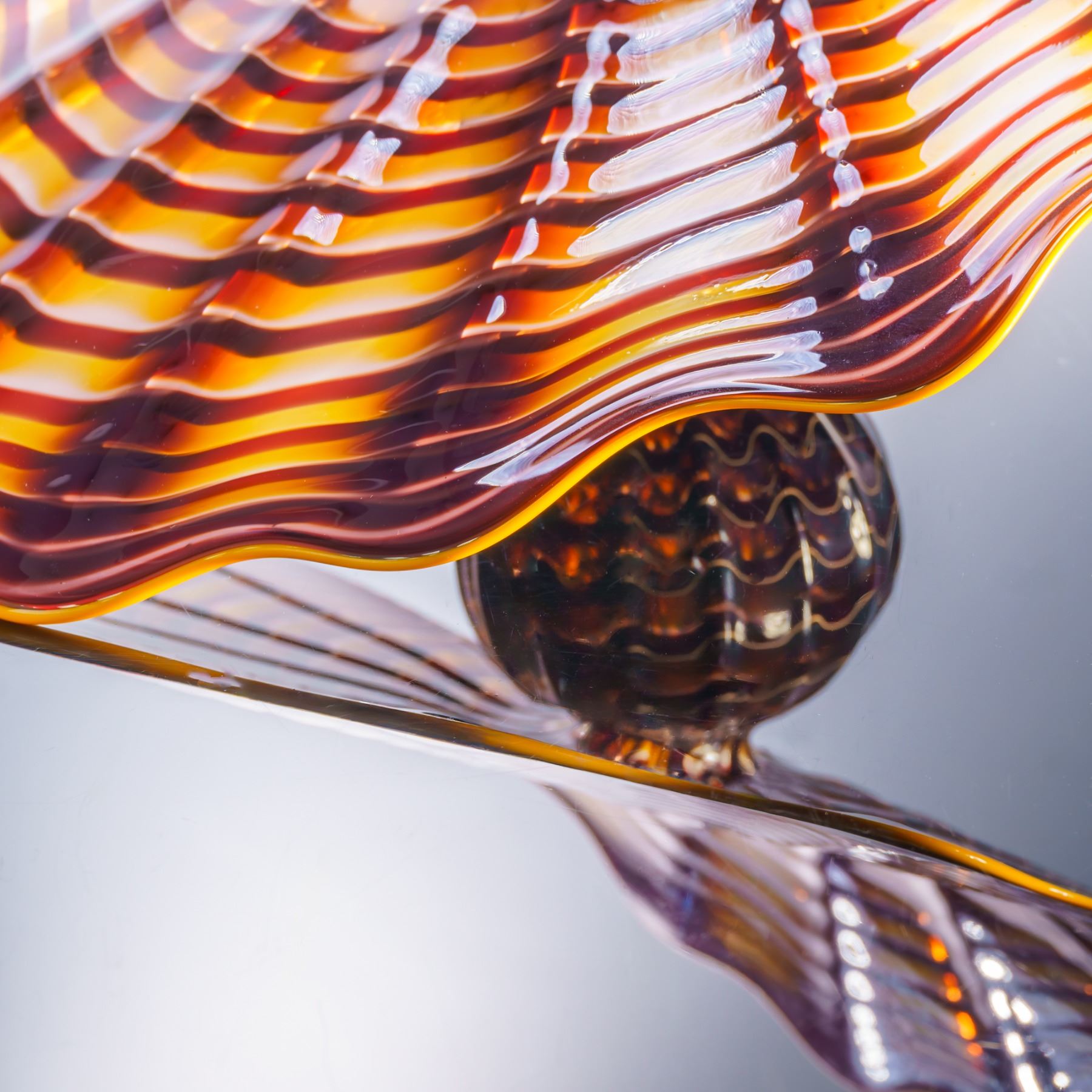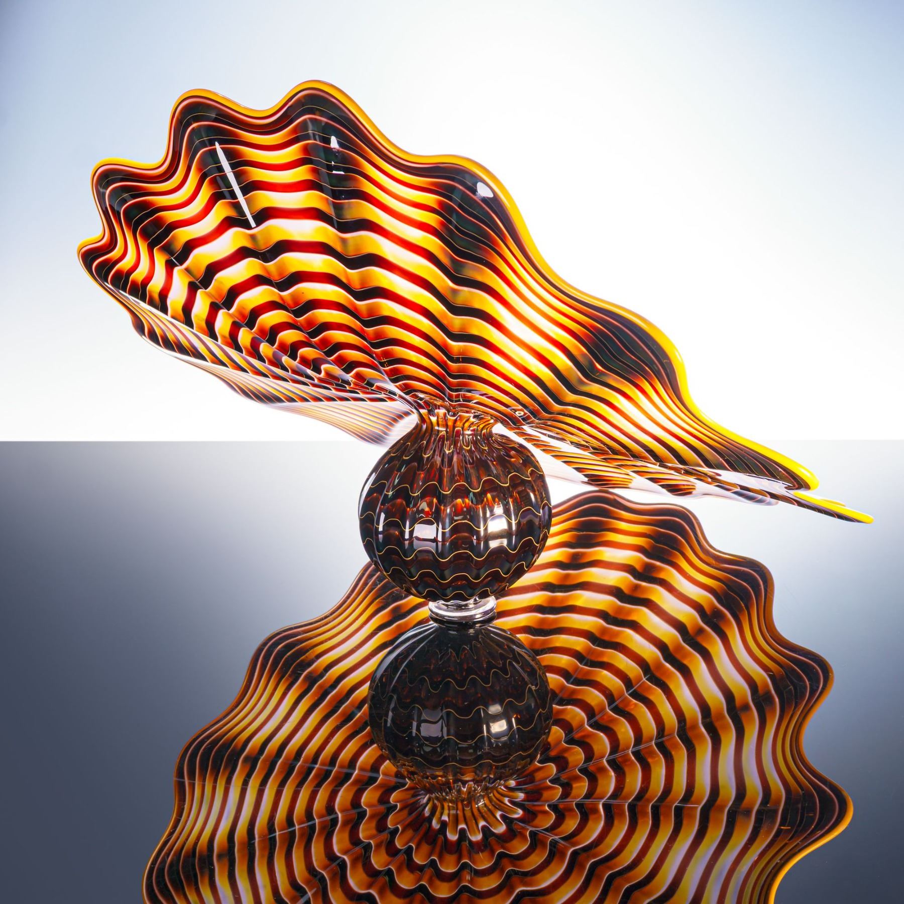 An extraordinary 2-piece Persian set by renowned American glass artist Dale Chihuly, celebrated for revolutionizing the art of contemporary glass. This vibrant pair exemplifies Chihuly's mastery of organic form and radiant color. Each undulating shell-like form displays mesmerizing striations of violet, amber, crimson, and gold, highlighted by fluid, rippling edges that evoke the rhythm of the sea. The luminous interplay of light within the glass reveals remarkable depth and motion, a hallmark of Chihuly's celebrated Persians series. Born in Tacoma, Washington, Dale Chihuly is internationally acclaimed for elevating glass to the realm of fine art. His pioneering techniques and large-scale installations, such as those exhibited at the Venetian, the Bellagio, and the Victoria and Albert Museum, have made him one of the most influential figures in modern glass sculpture. A breathtaking example of Chihuly's dynamic artistry, capturing the essence of color, form, and light in timeless sculptural harmony.
