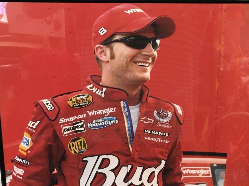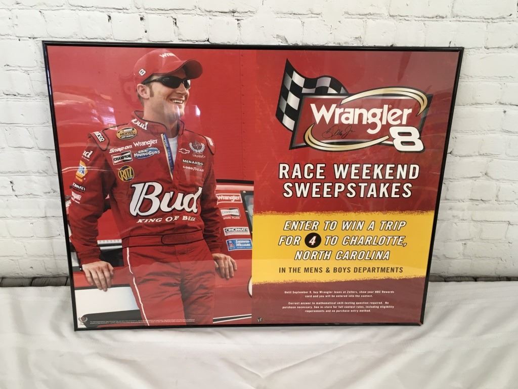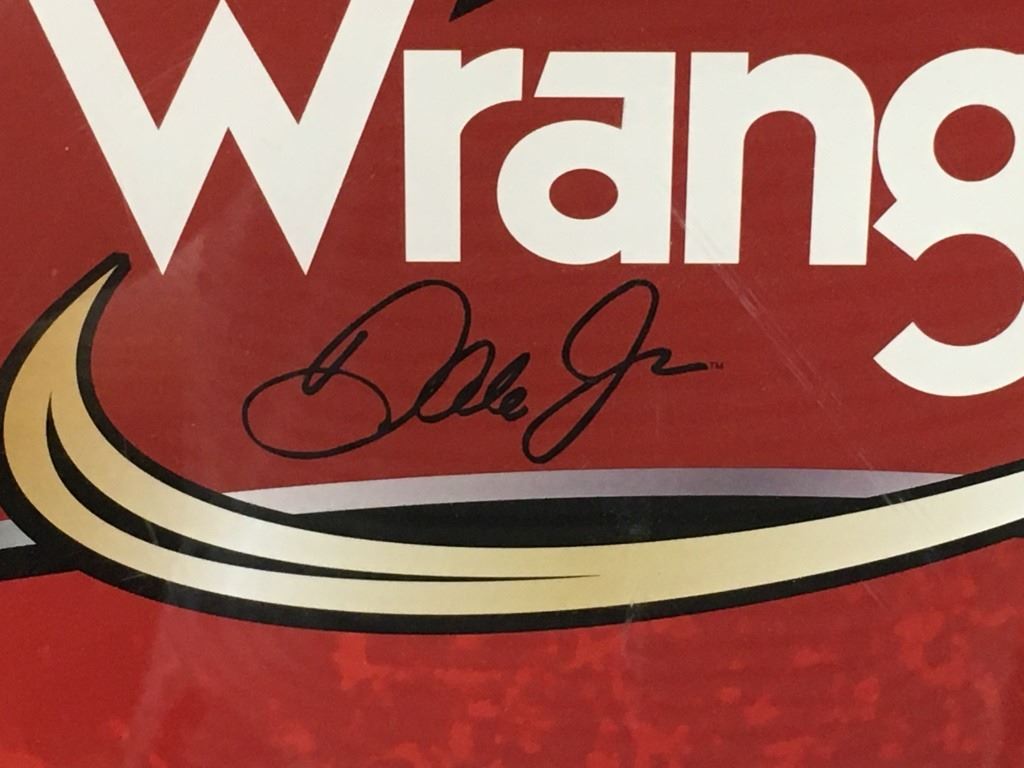 This is a framed poster of Dale Earnhardt Jr Advertising for Wrangler Jeans. It measures about 22 x 28 inches with the frame. It is autographed, "Dale Jr" , top right corner but looks like a facsimile signature. The condition is good, some wear to the frame.
