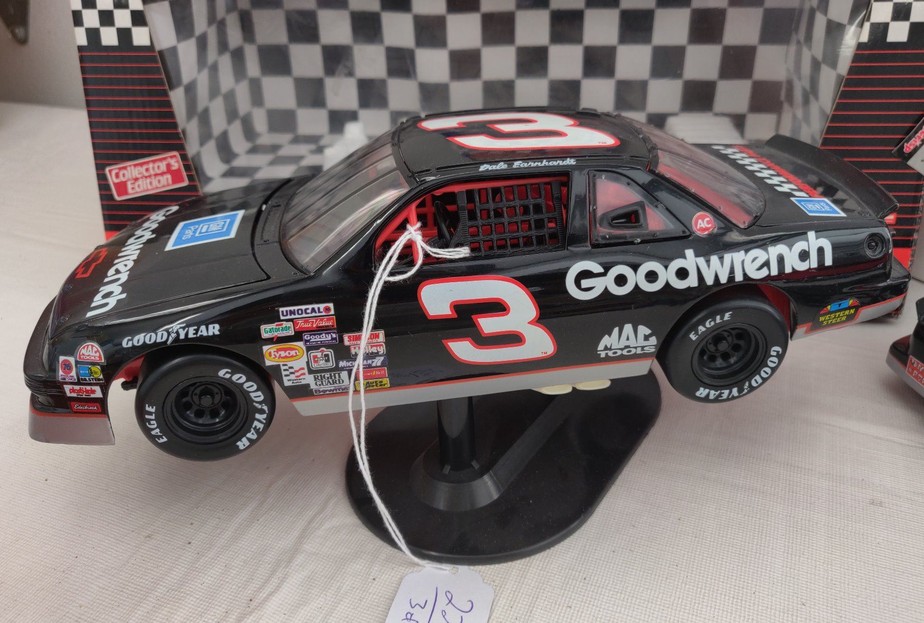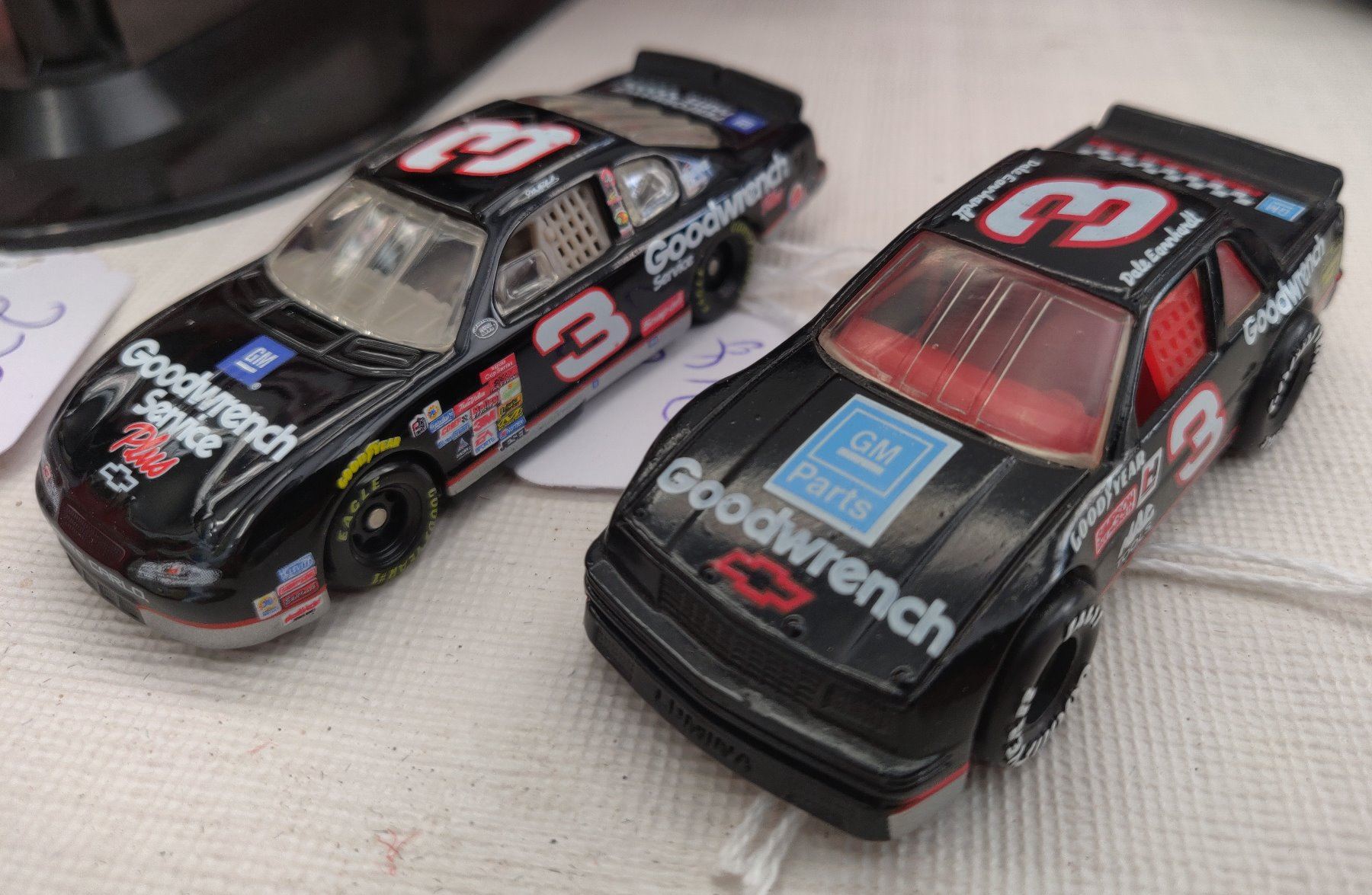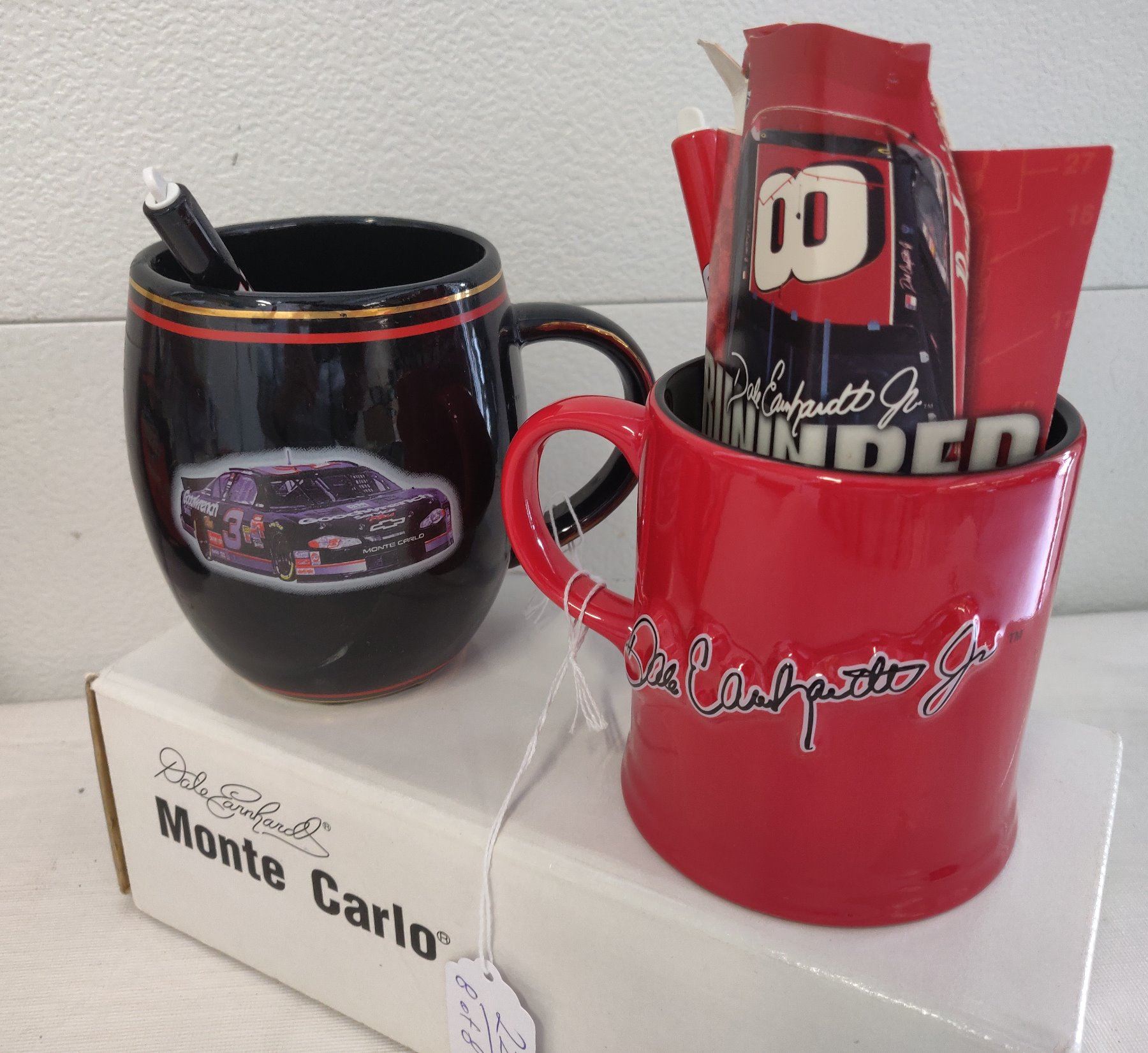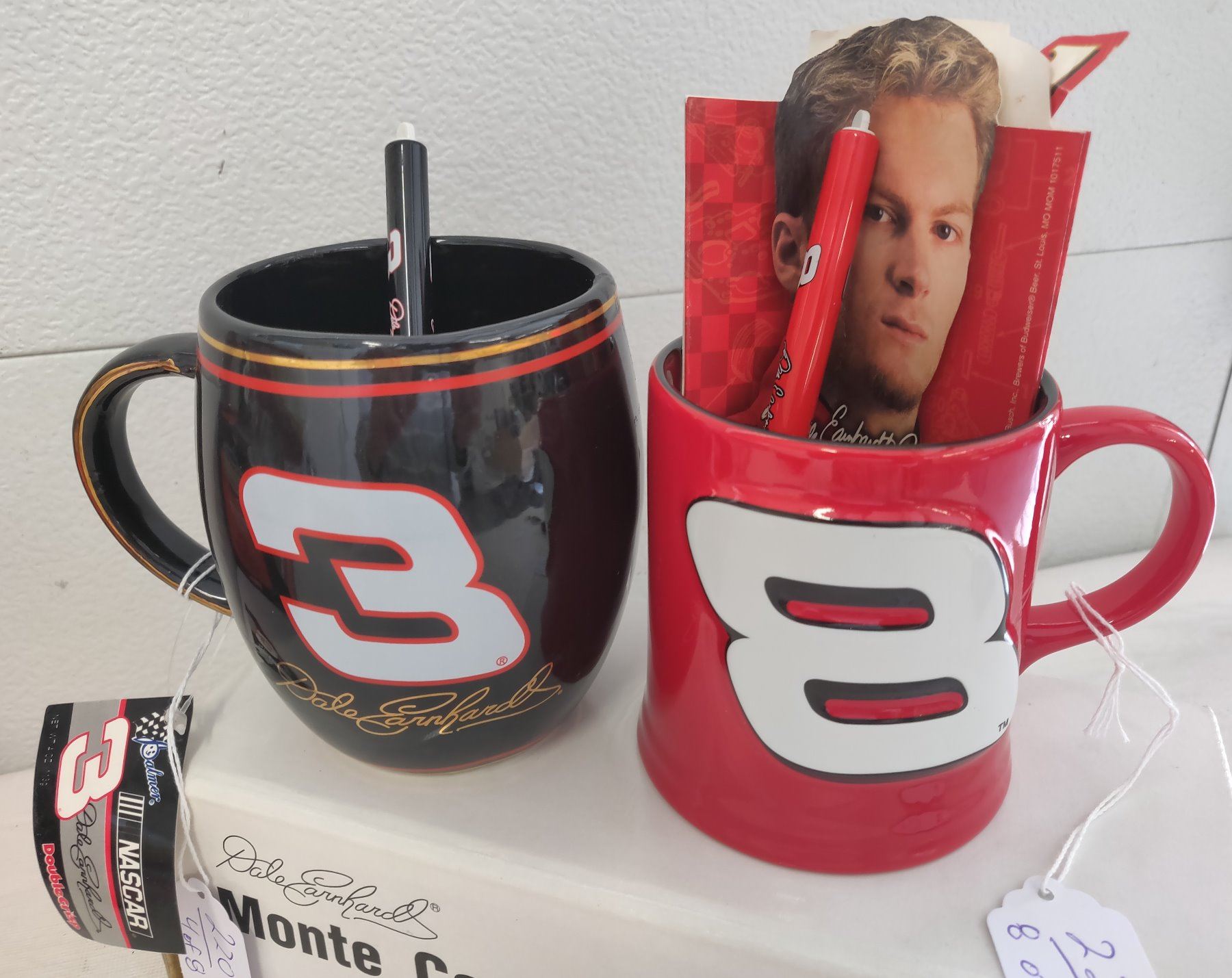 Dale Earnhardt Memorabilia Collection, modern items. Made of die cast metal, plastic, ceramic mugs, etc., the 2 largest toy models measure from 8 1/4" to 10 1/2" long. Included in lot are 2 models of Dale Earnhardt's #3 car, 2 smaller toy cars, a matchbox of 1000 matches, keychain, tire gauges and mugs with some original packaging. Shipping: $45.00 USA estimate only, w/insurance and signature, due to size and weight.