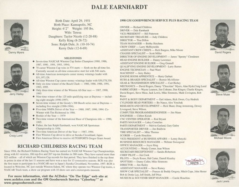Hand-signed in blue felt-tip pen by Dale Earnhardt (HOF D 2001). Autograph includes an official James Spence Authentication (JSA) hologram and matching COA for authenticity purposes.
