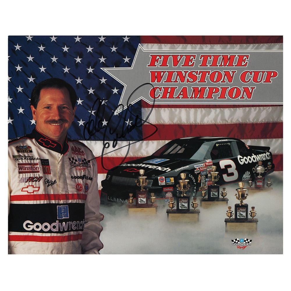Color glossy 10 x 8 cardstock photo of the 'Five Time Winston Cup Champion' wearing his Goodwrench racing uniform next to his five trophies and black Chevy Lumina, signed in black felt tip by Dale Earnhardt. In fine condition.