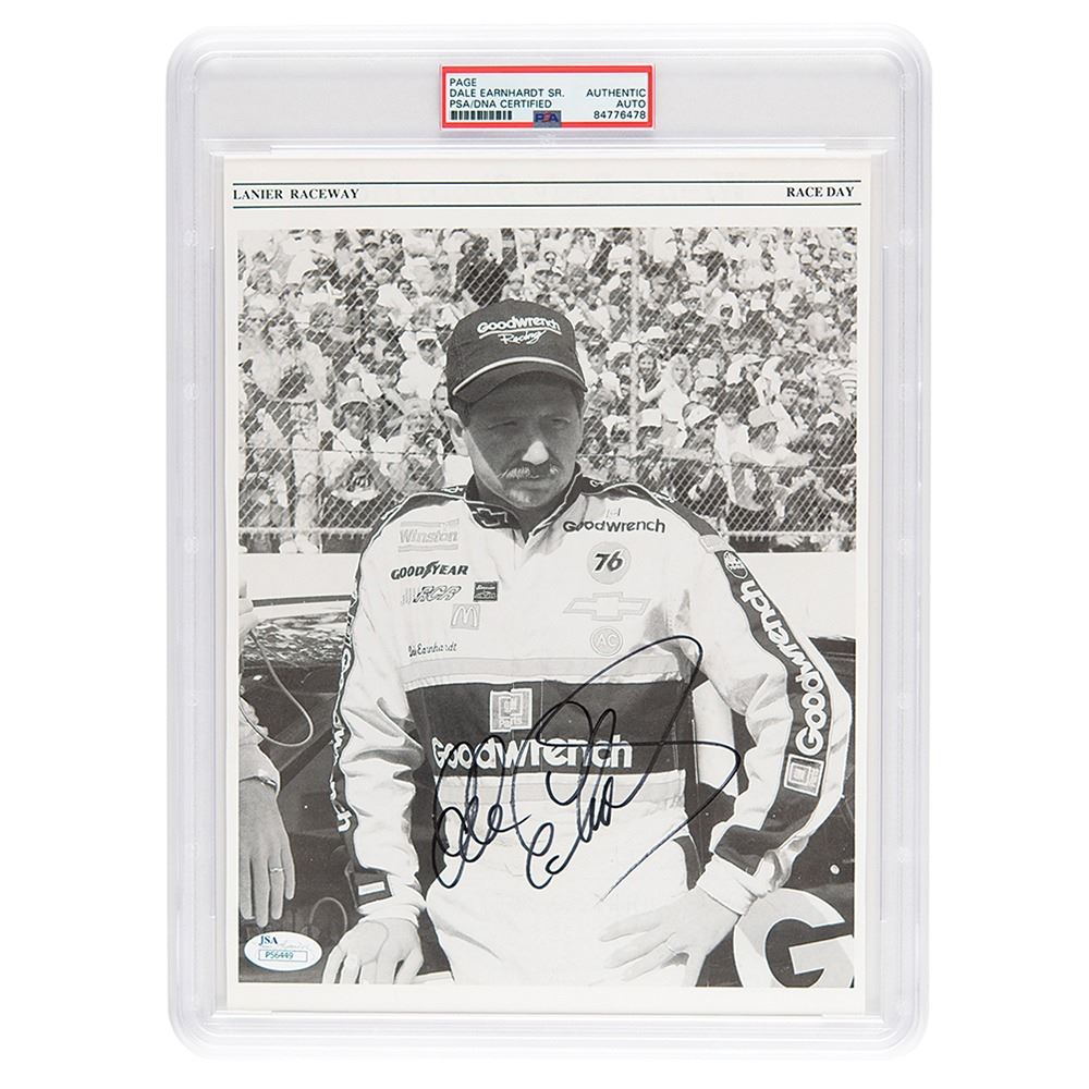 Semi-glossy 8.25 x 11 promotional photo of Dale Earnhardt by Wren& #39;s Body Shop of Douglasville, Georgia, signed in black felt tip. In very fine condition, with a JSA label affixed to the lower left corner. Encapsulated in a PSA/DNA authentication holder.