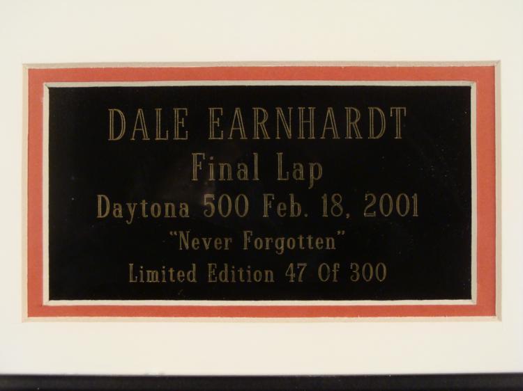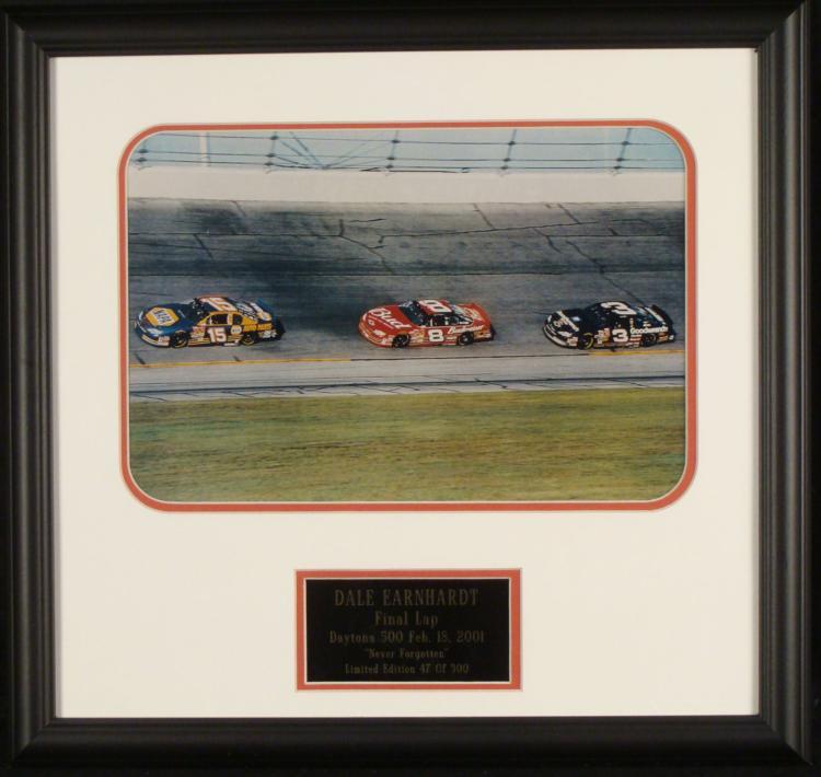 This is a limited edition photo of NASCAR legend Dale Earnhardt Sr in his final lap in his #8 Budweiser Chevy Monte Carlo at Daytona. Underneath is an engraved plaque marking the location and date, and commemorative words: "Never Forgotten." It is also numbered 47/300. The photo and plaque are both nicely double matted in red and white, in a matte black wood frame. The image size is 9" x 13 1/4", and the frame is 18 1/2" x 19 1/2. Its condition is excellent.
