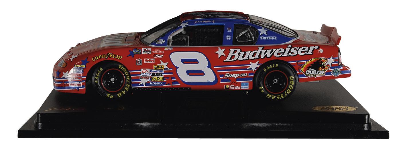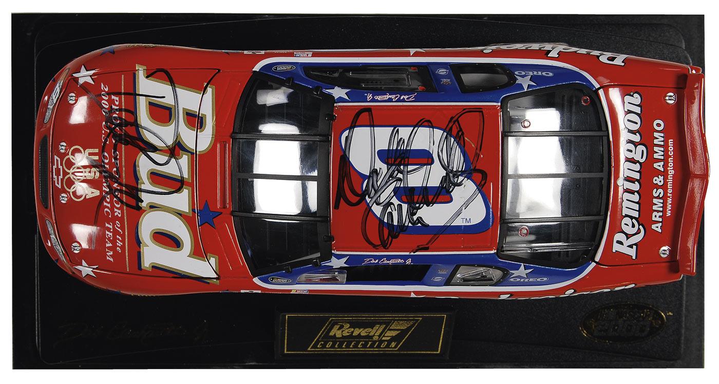 Revell diecast 1:24 scale Budweiser/2000 Olympics Chevrolet Monte Carlo race car, signed on the roof in black felt tip by Earnhardt, Sr., and on the hood in black felt tip by Earnhardt, Jr. In fine condition. Accompanied by the original box and a Certificate of Authenticity signed by Dale Earnhardt, Jr. Pre-certified Steve Grad/PSA/DNA and RRAuction COA.