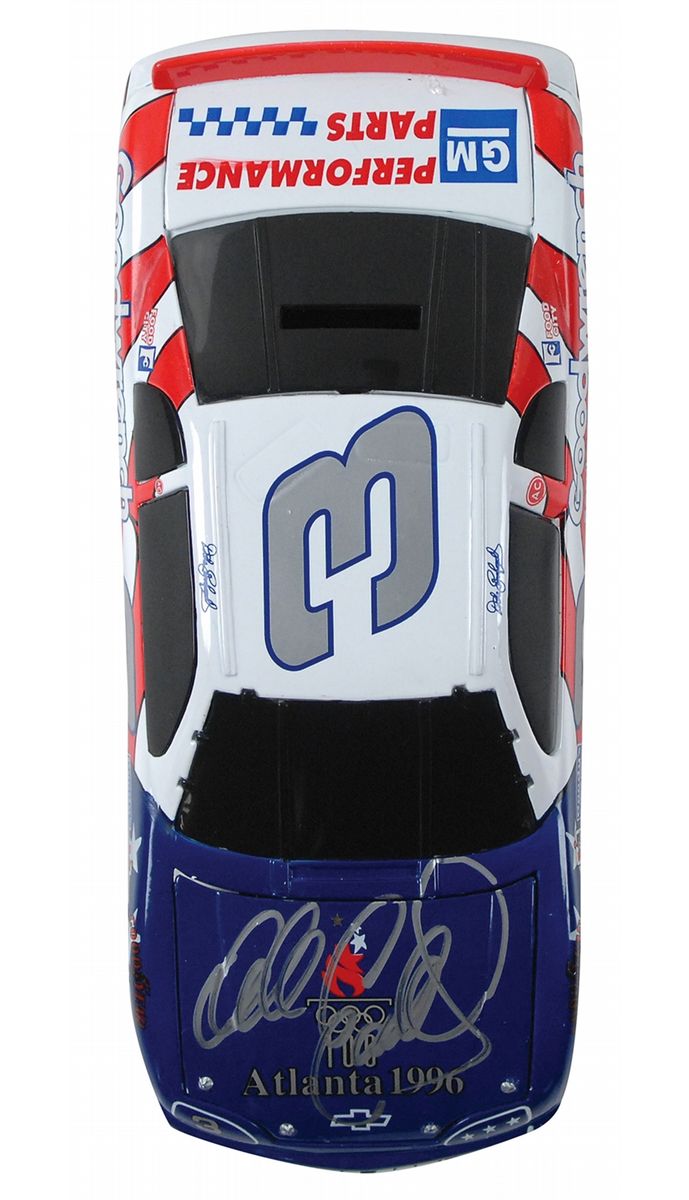 Sports Image die-cast replica bank of Earnhardt’s Chevrolet Monte Carlo race car, approximately 8? long, signed on the hood in silver ink. In fine condition.