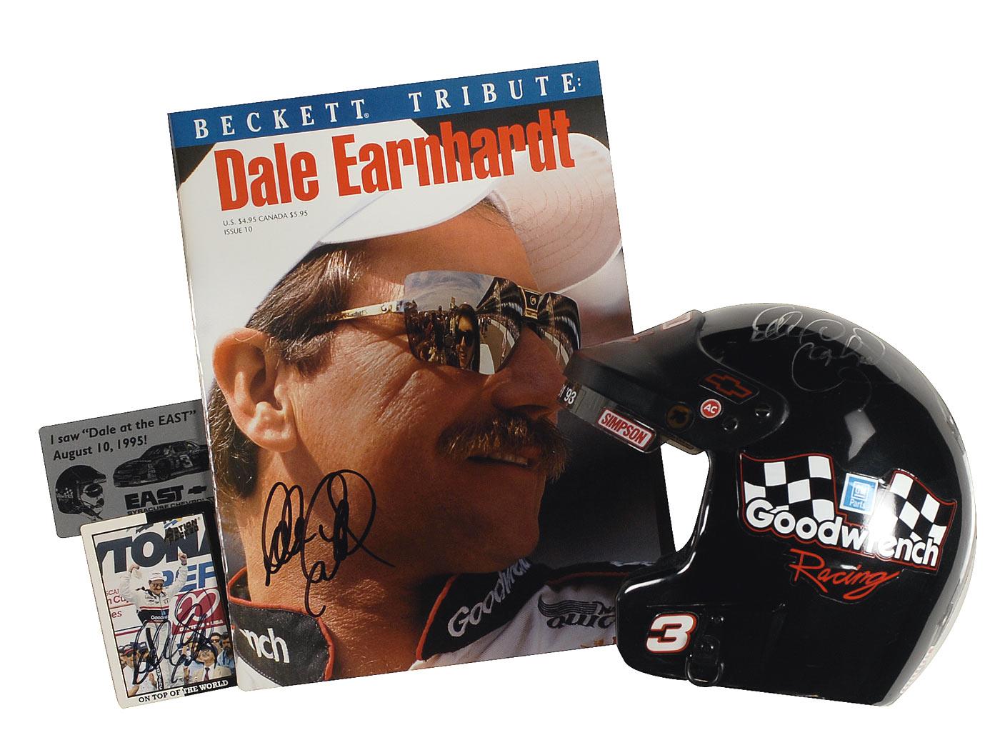 Three items: Beckett Tribute to Dale Earnhardt magazine, signed on the front cover in black felt tip; an Action packed trading card, signed in black felt tip; and a souvenir mini-racing helmet, honoring Earnhardt’s championships, signed in silver ink. In fine condition.