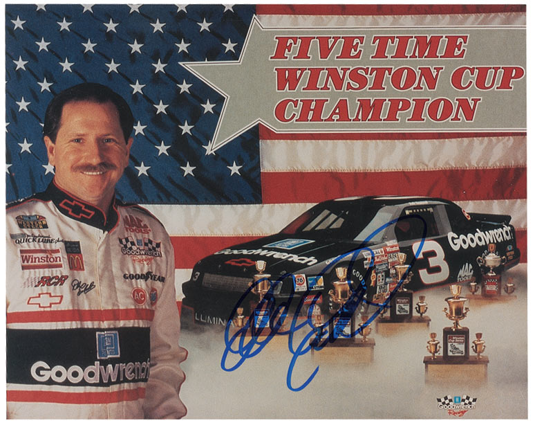 Color glossy 10 x 8 photo of Earnhardt posing with his five Winston Cup trophies, signed in blue felt tip. In very fine condition.