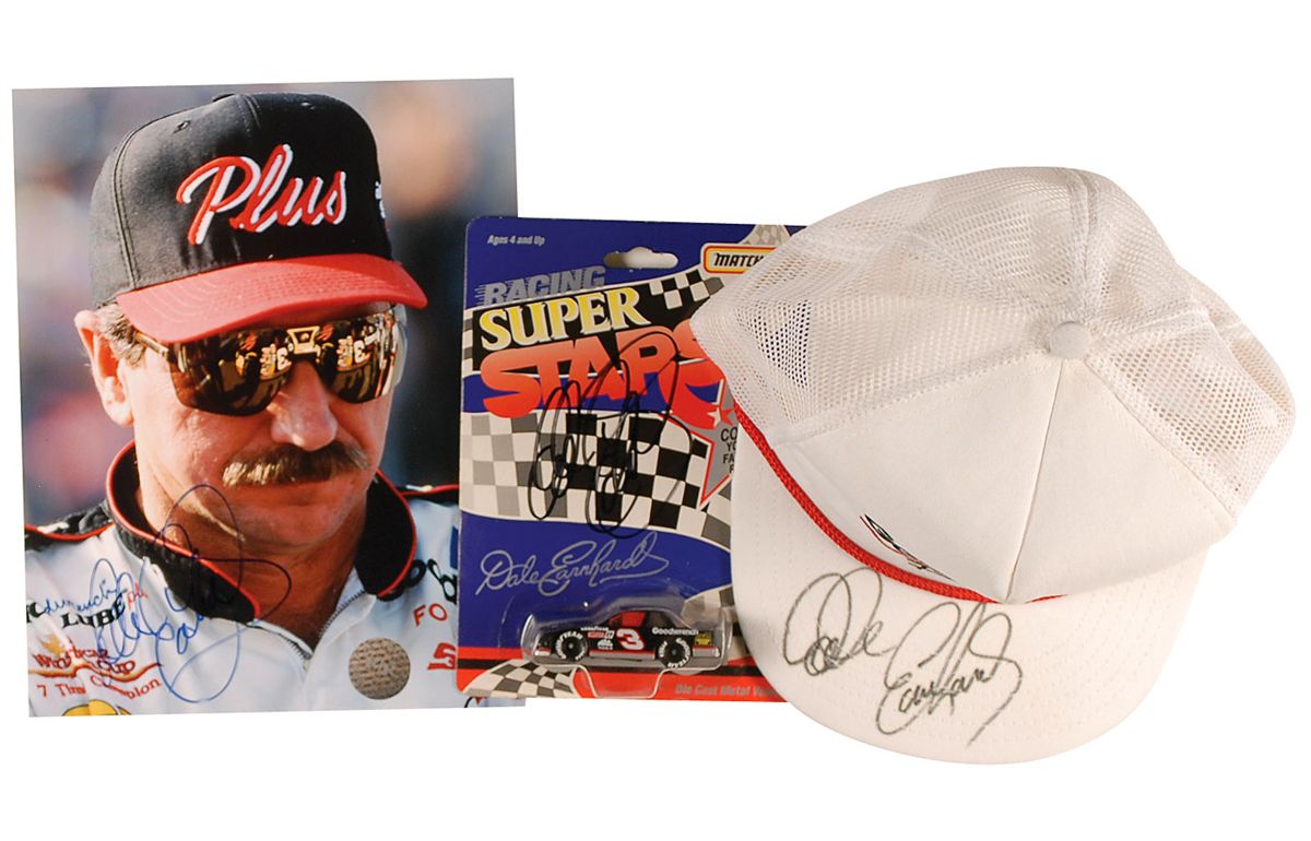 Three items: Goodwrench Racing baseball cap, signed on the brim in black felt tip; a Matchbox Racing Superstars die cast car, signed on the packaging in black felt tip; and a color glossy 8 x 10 photo of Earnhardt before a race, signed in blue felt tip. In fine condition.