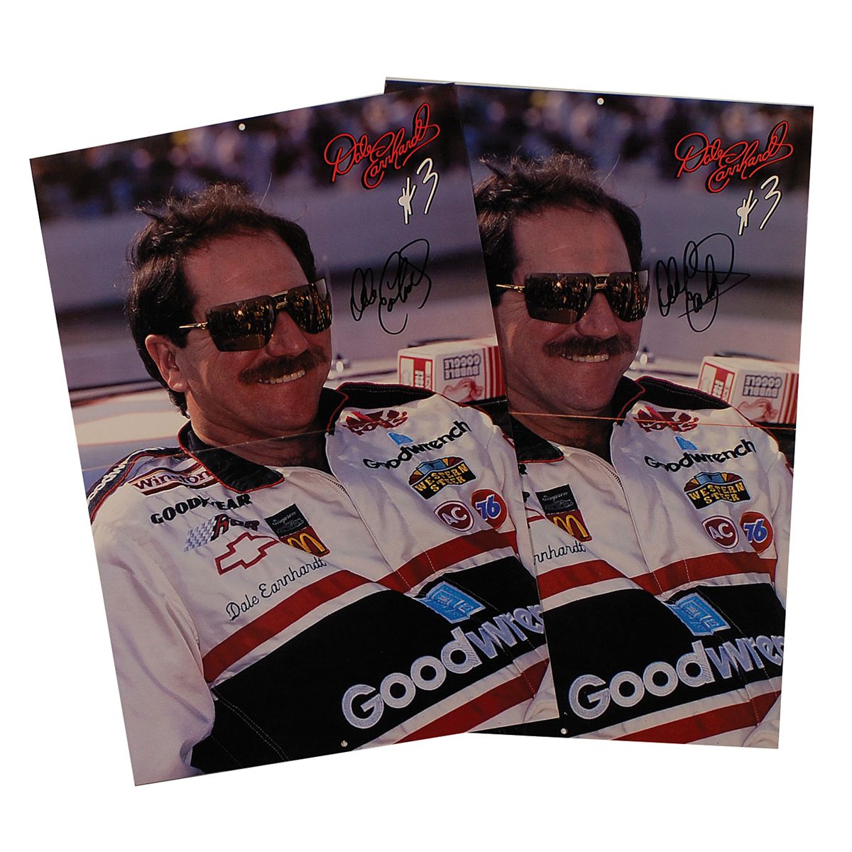 Two 14 x 10.5 Goodwrench Dale Earnhardt calendars, each signed in black felt tip on a large portrait of Earnhardt in the inner cover. In fine condition, with scattered light creasing to the binding.