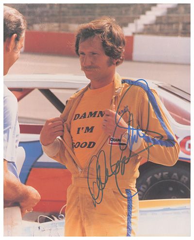 Color 8 x 10 cardstock photo of Earnhardt flashing his ‘Damn I’m Good’ t-shirt, signed in blue felt tip. In fine condition, with some light vertical rippling to lower portion of photo.