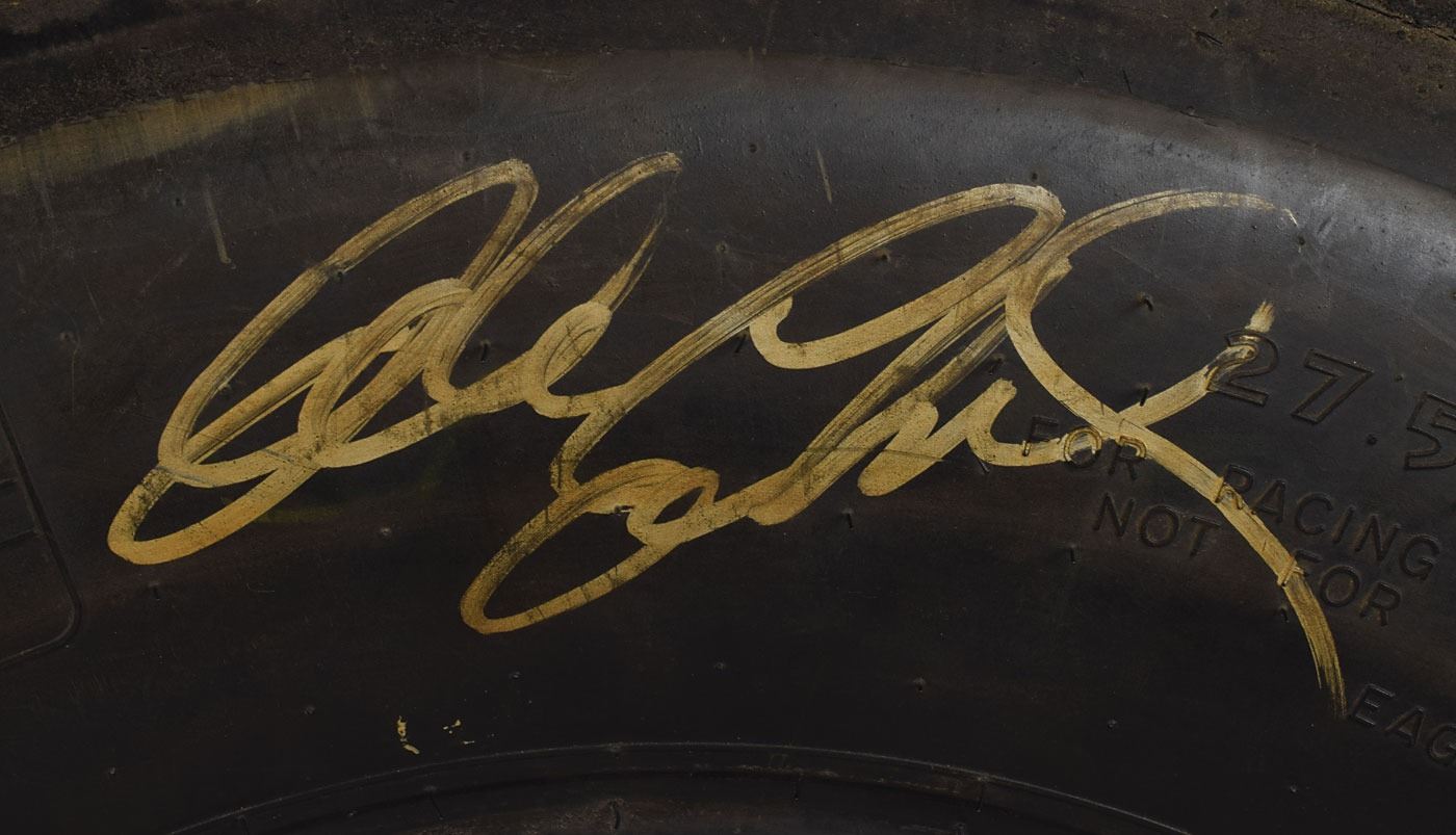 Goodyear Eagle 1 racing tire, 27? in diameter, signed on the side wall in gold ink by Earnhardt. In fine condition, with obvious signs of expected wear.
