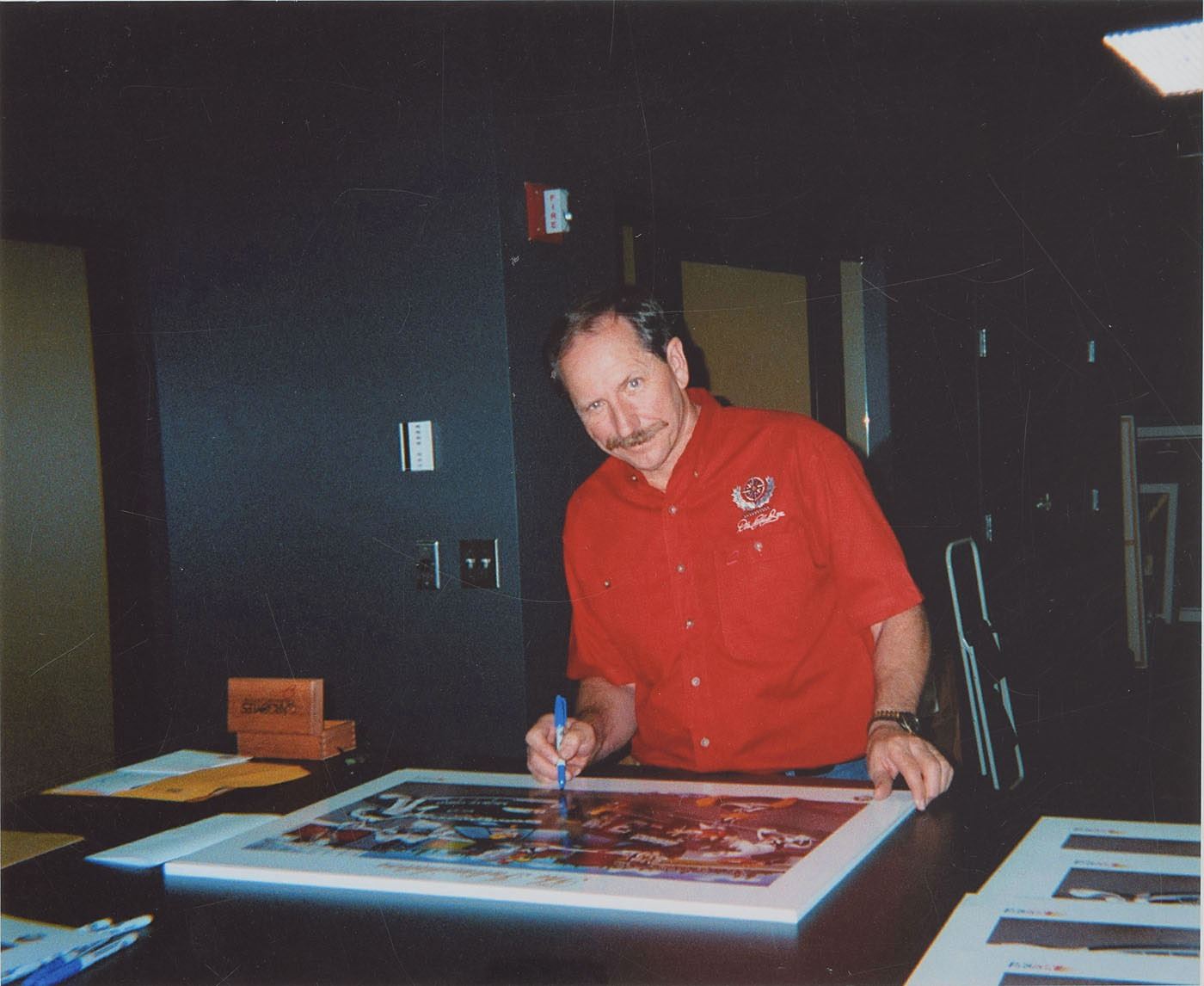 Limited edition color 32.25 x 18.5 lithograph from NASCAR and Warner Bros. entitled 'The Intimidators,' showing Earnhardt posing next to his No. 3 car with a variety of Looney Tunes characters, numbered 1557/2500, signed in blue felt tip the racing legend. Rolled and in fine condition. Accompanied by a certificate of authenticity from Toon Art, as well as a photo taken at the time of signing.