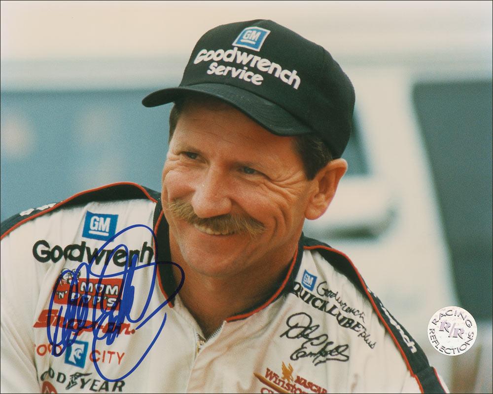 Seven-time Winston Cup Champion who died in a last-lap crash during the 2001 Daytona 500. Color glossy 10 x 8 photo, signed in blue felt tip. In very fine condition, with an authentication hologram affixed to lower right.