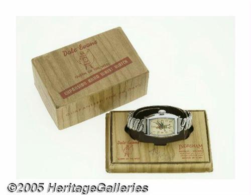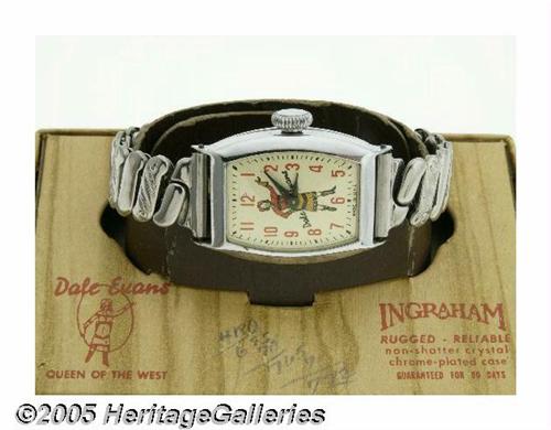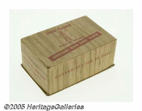 <B>Dale Evans Wrist Watch in Box (Ingraham, undated).</B></I> Dale Evans wrist watch in original box. Chrome-plated expansion band. Very minor wear to box. Box and watch in Excellent condition. <I>From the Larry Jacobs Collection.</B></I>