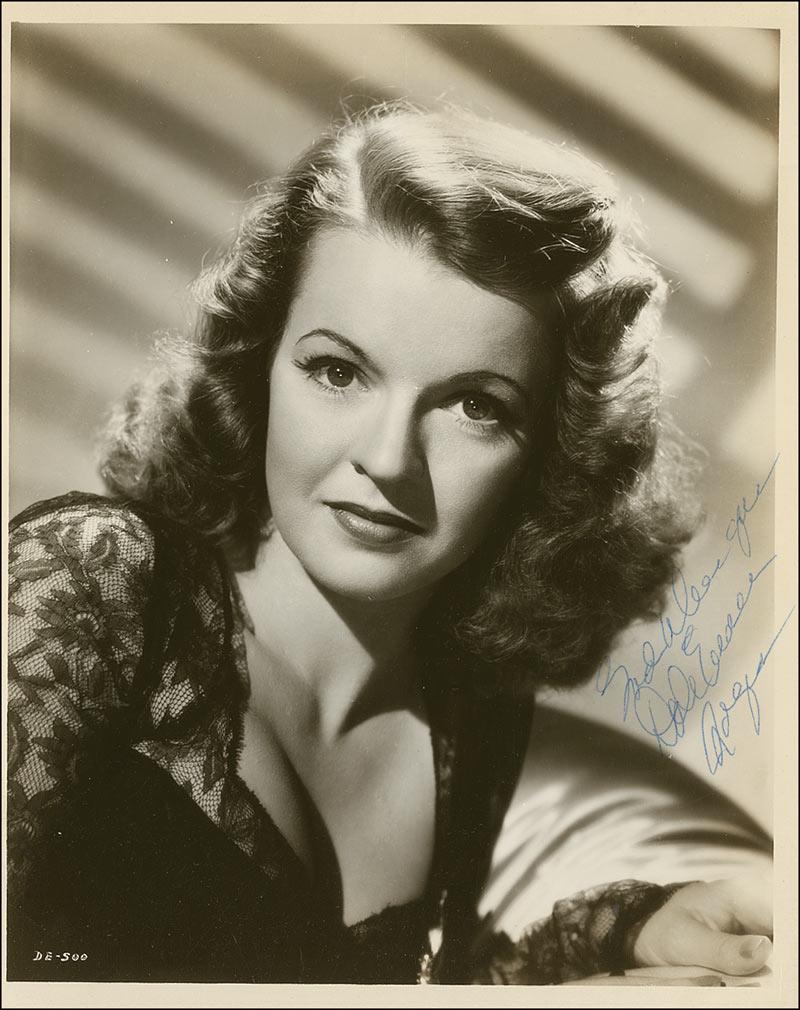 Glossy 8 x 10 photo of Evans dressed in black lace, signed in blue ballpoint, “God bless you, Dale Evans Rogers.” In fine condition, with some scattered light creases and surface marks.