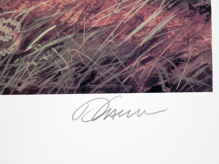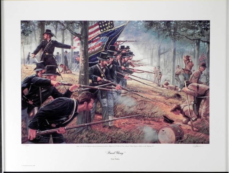 July 1, 1863, the Iron Brigade routing and capturing part of Archer's Brigade of A.P. Hill's 3rd. Corp, Army of Northern Virginia in Herbst's woodlot, Gettysburg, PA. * * * * Artist: Dale Gallon * * Title: Final Glory * * Medium: Print on paperEdition: Out of 3600Date: 1990Signature: Signed and numbered by the artist in pencilImage Size: 16" x 24 1/2"Paper Size: 22 1/4" x 29 1/2"Condition: ExcellentAuthenticity: Included * Biography * * Each of Dale's paintings is a history lesson on canvas. He is known for his attention to detail and historical accuracy. To assist the collector in understanding the history, important people and landmarks are identified on the upper and lower borders of * the print. To assist Dale in the complex research, he employs a staff historian who is responsible for researching every detail and writing a comprehensive historical essay. This essay accompanies each print number as the print. Dale Gallon's art stands in * a class of its own - for the collector who seeks historical accuracy. * * * * Retrieved from: http://www.gallon.com/about.asp