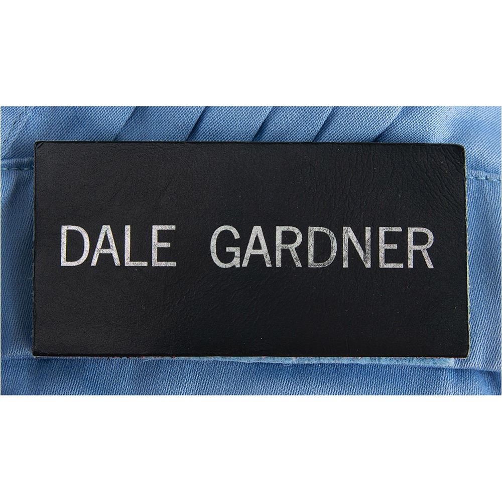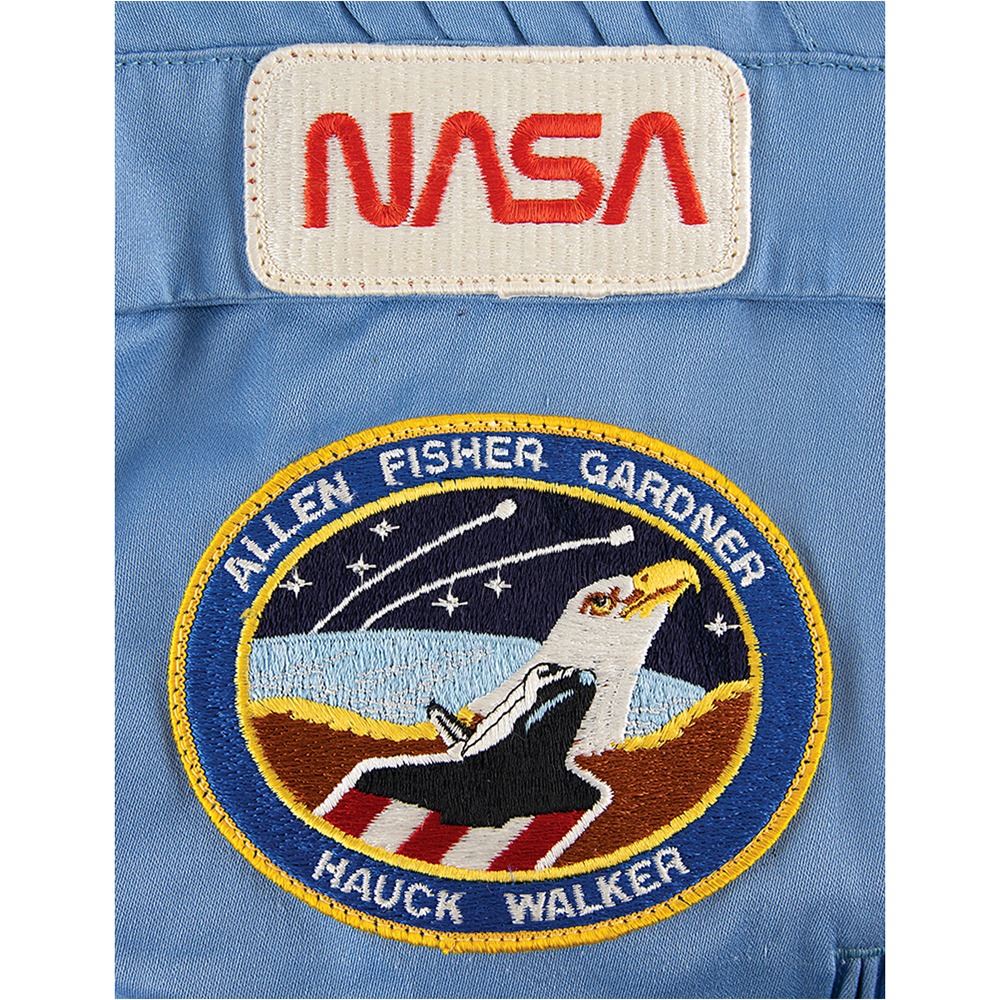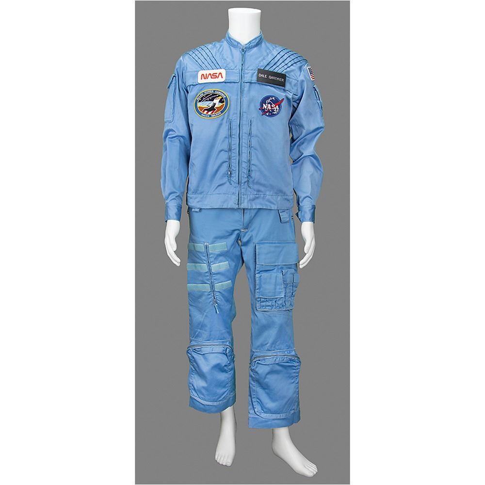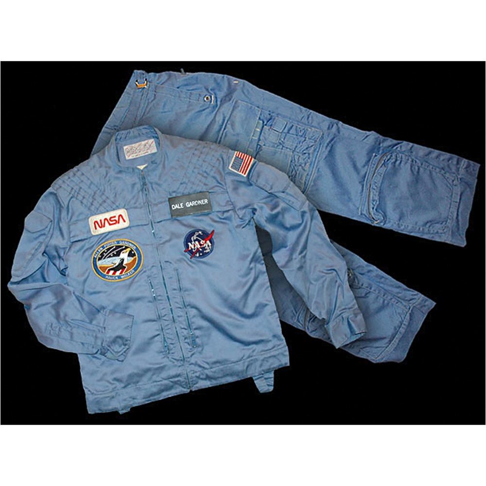 Dale Gardner's flown blue flight suit worn aboard the Space Shuttle Discovery on the STS-51-A mission, comprising his jacket and pants. The zip-up jacket features embroidered NASA 'meatball' and 'worm' logo patches on the chest, as well as a large STS-51-A mission patch and "Dale Gardner" name patch attached with Velcro. The left shoulder features an embroidered patch of the flag of the United States. The original ILC Space Systems tag is sewn inside the collar, reading: "Item: Jacket, Part No. 10101-20001-04, Serial No. N/A, Size M/R, Code ID 74897, Mfg. 11/83, Contract No. NAS9-16589." The tag was evidently struck through with red ink when the jacket was downgraded to a Class III non-flight item in 1990, as indicated by the accompanying non-functional equipment parts inspection tag. Includes its original bag with NASA-JSC cleaning label and attached red NASA property tags for the jacket and name tag.