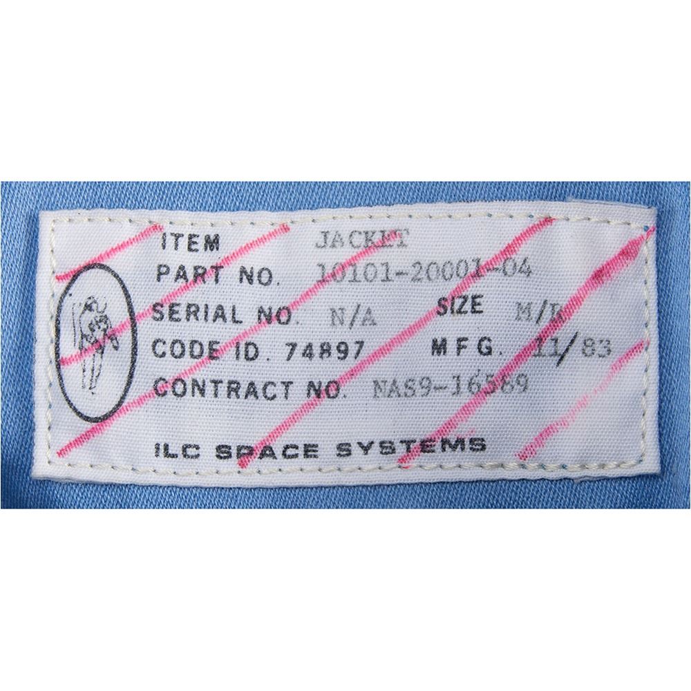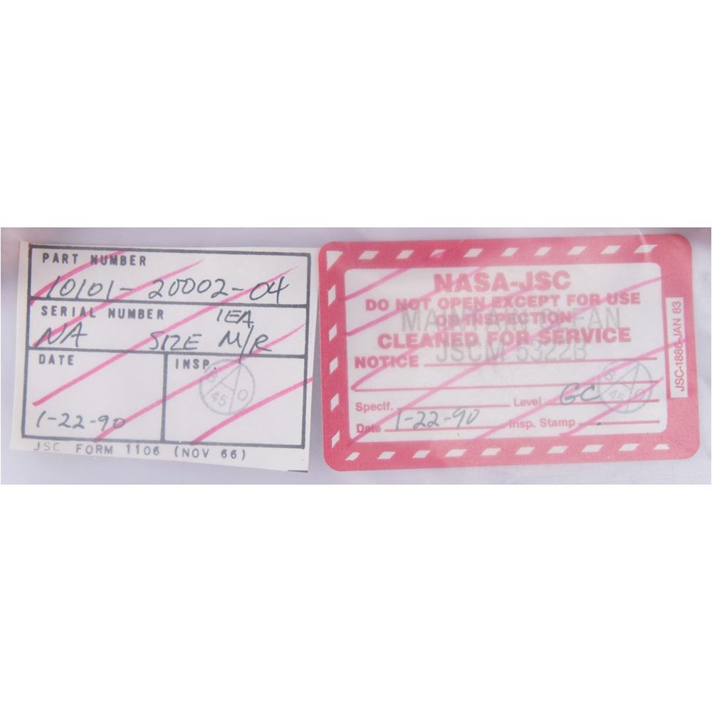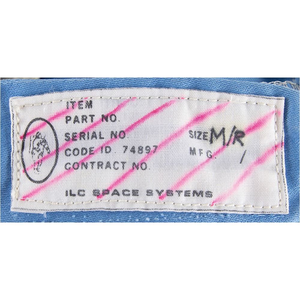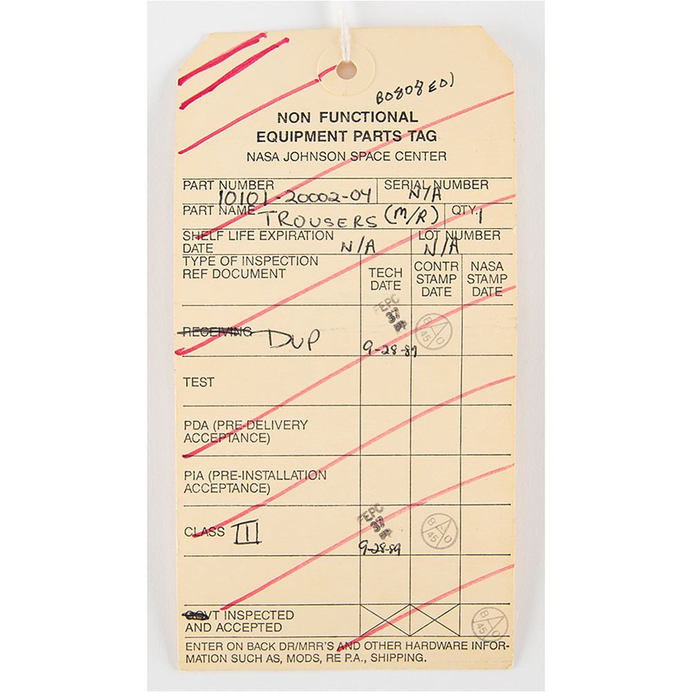 The matching trousers have the original ILC Space Systems tag inside the fly, which is faded but has most numbers recorded on the accompanying non-functional equipment parts tag: "Item: Trousers, Part No. 10101-20002-04, Serial No. N/A, Size M/R." Like the tag in the jacket, it was evidently struck through with red ink when the trousers were downgraded to a Class III non-flight item in 1990. Also includes its original bag with NASA-JSC cleaning label.