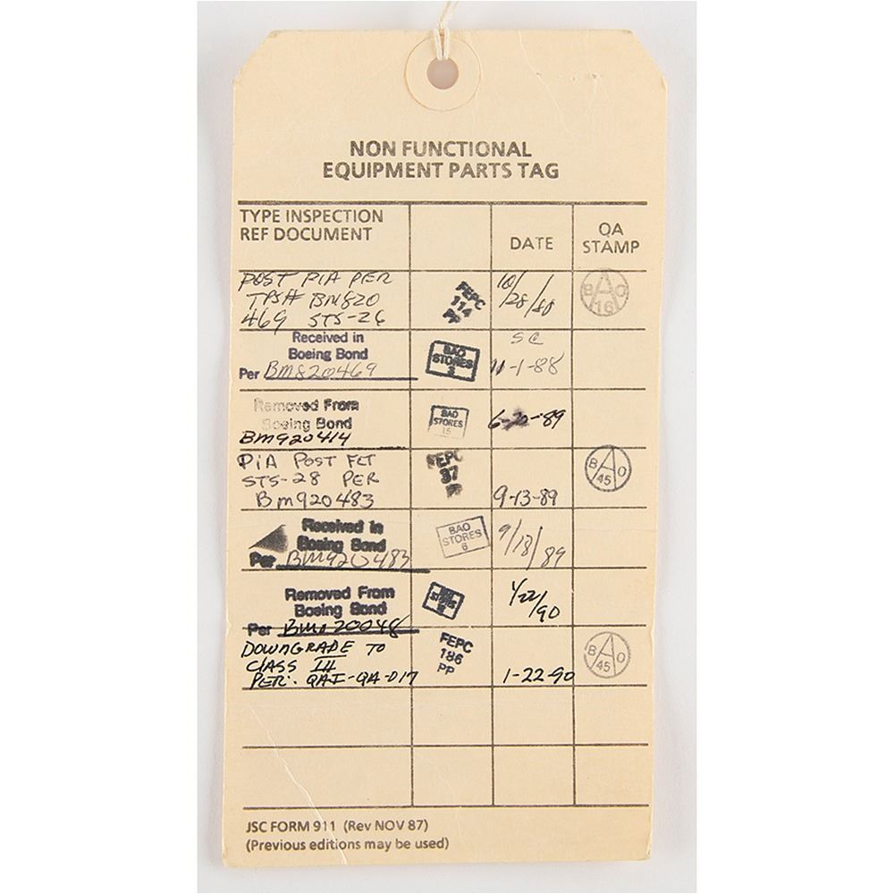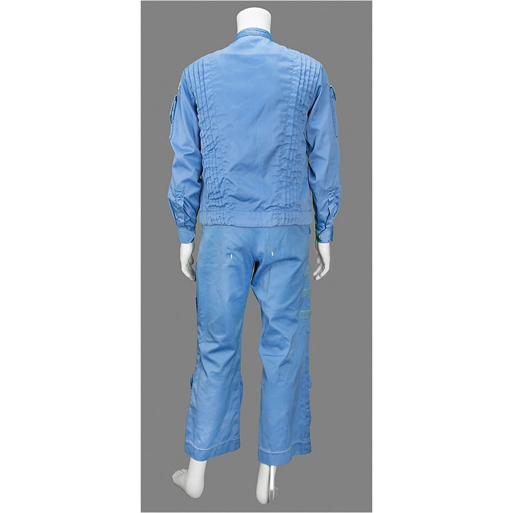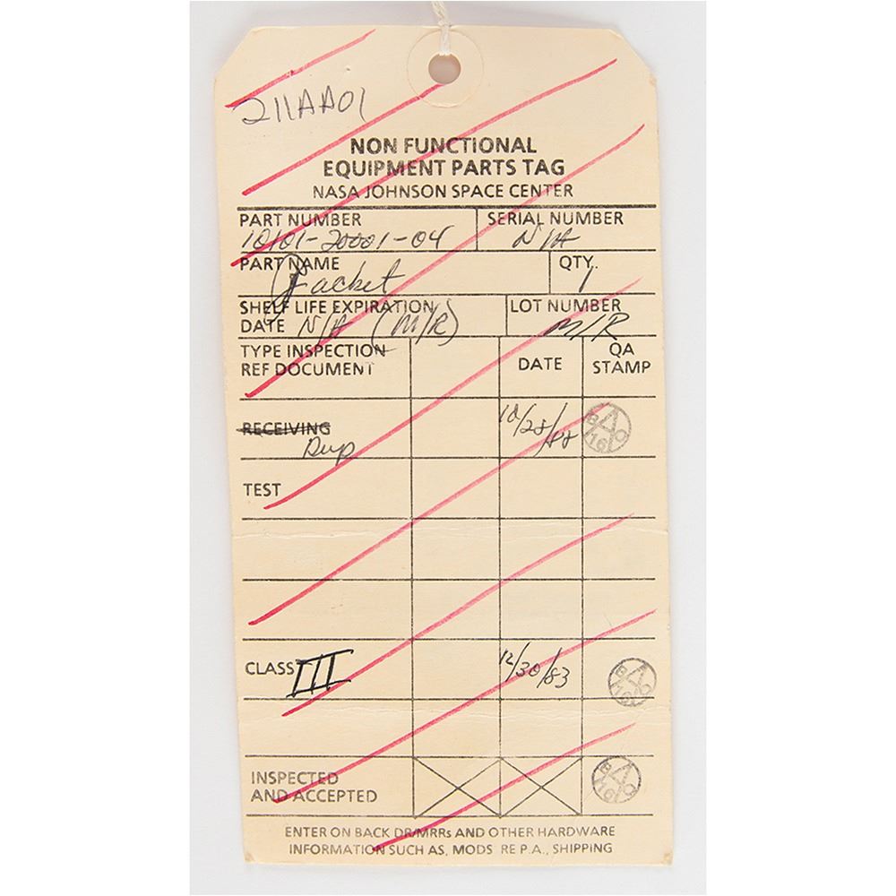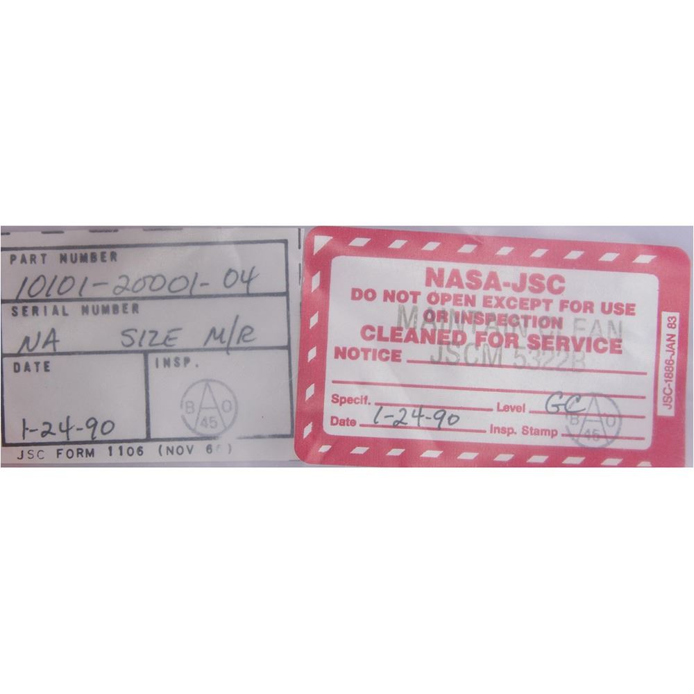 The matching trousers have the original ILC Space Systems tag inside the fly, which is faded but has most numbers recorded on the accompanying non-functional equipment parts tag: "Item: Trousers, Part No. 10101-20002-04, Serial No. N/A, Size M/R." Like the tag in the jacket, it was evidently struck through with red ink when the trousers were downgraded to a Class III non-flight item in 1990. Also includes its original bag with NASA-JSC cleaning label.