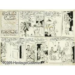 <B>Dale Messick - Brenda Starr Reporter Sunday Comic Strip Original Art, dated 8-16-42 (The Chicago Tribune, 1942).</B></I> When Brenda Starr discovers that her fiancee, Eric Keller, is a spy for a rival newspaper, she takes the news badly. This bittersweet Sunday comic strip from August 16, 1942 has poor Brenda facing the heartbreak of a torn engagement and betrayal. These terse frames of broken hearted Brenda by Dale Messick are genuinely emotional. The panels have been cut and remounted onto two boards with an image area of approximately 19" x 13.5". There is some staining in several panels of the first sheet, otherwise this work is in Very Good condition.