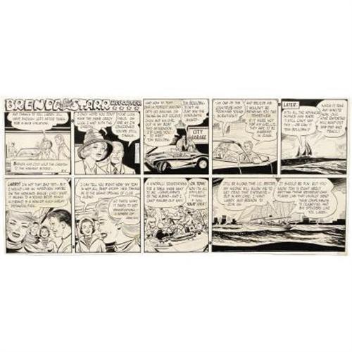 <B>Dale Messick - Brenda Starr Sunday Comic Strip Original Art, dated 5-1-60 (Chicago Tribune, 1960). </B></I> Brenda is a gal on the go in this fun-filled Sunday. The image area of this strip measures 28" x 12.5", and the art consists of individual frames which have been attached to a larger piece of illustration board. There is some overall aging apparent and some lettering corrections; otherwise, the art is in Very Good condition. <BR><BR><b>Shipping:</b> Flat Material, Large (<a target="_blank" href="http://www.heritageauctions.com/common/shipping.php">view shipping information</a>)