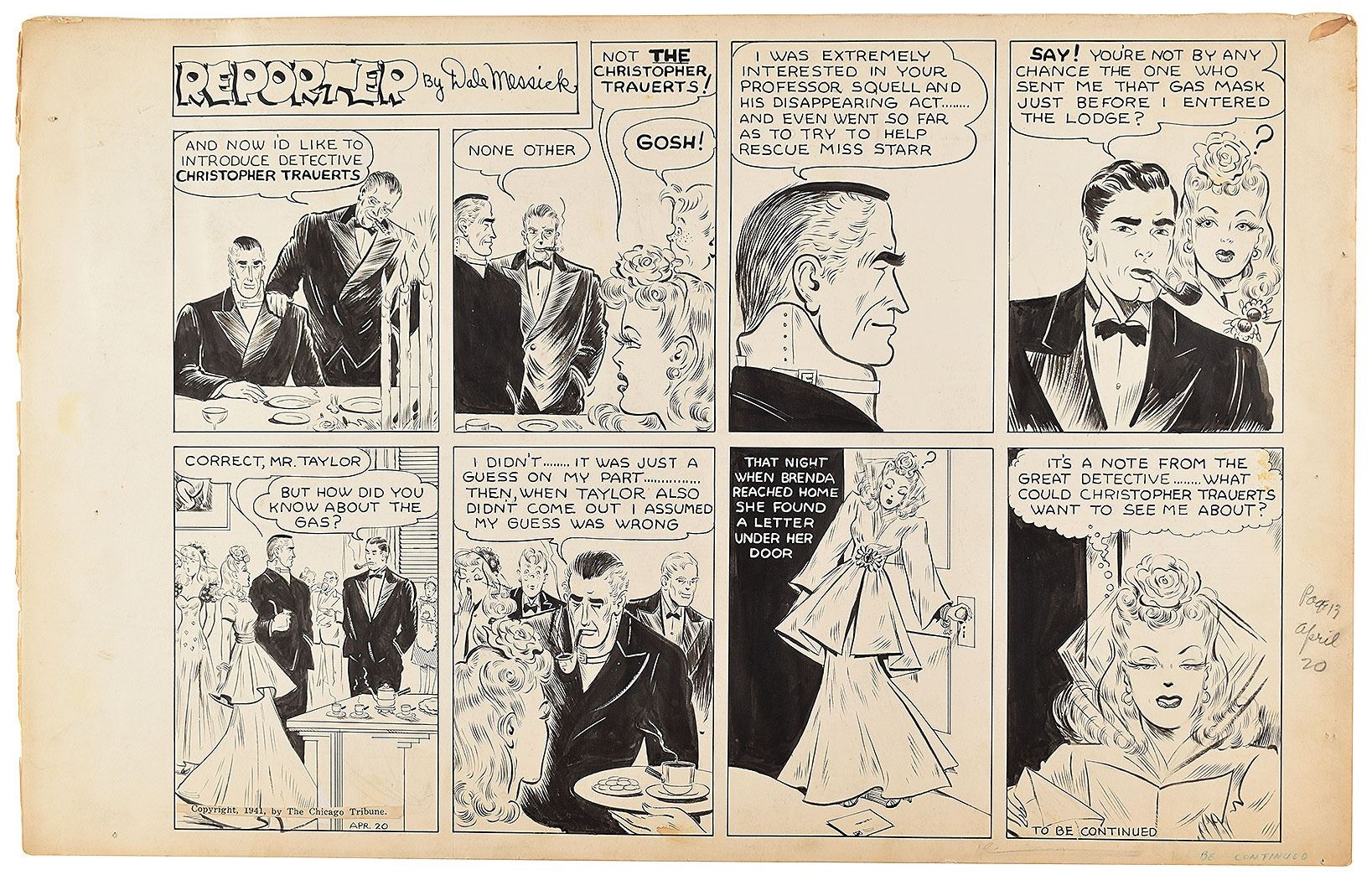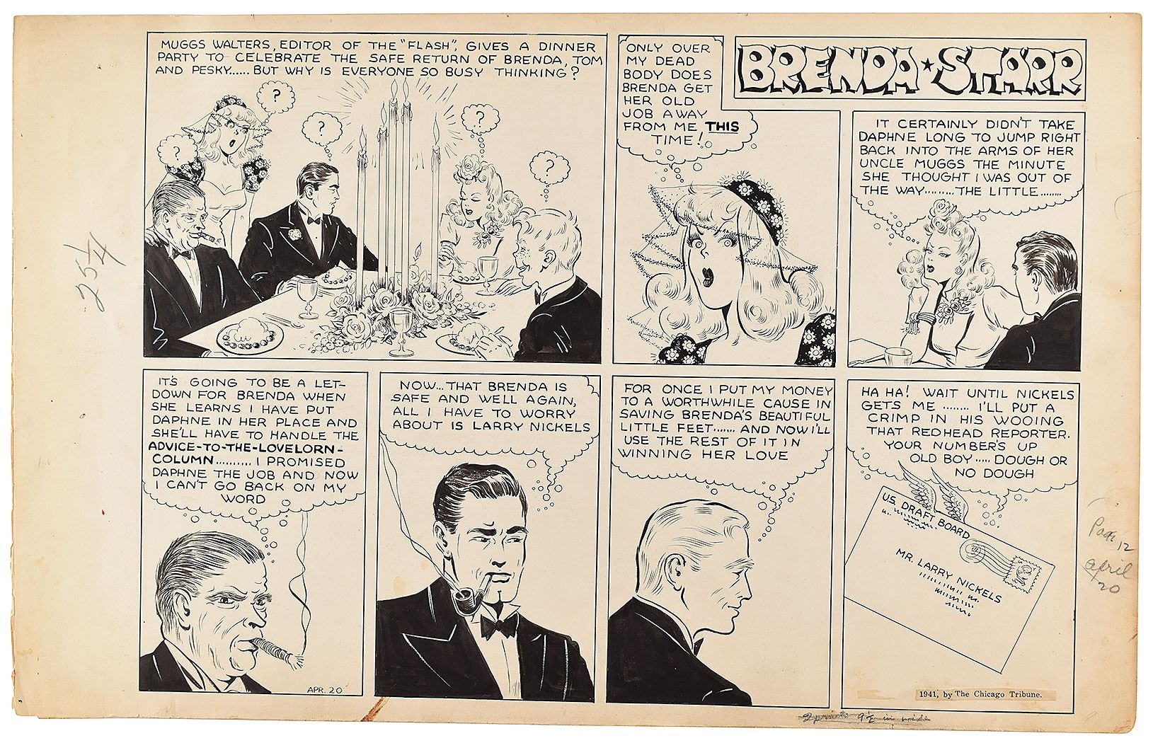 Impressive original hand-inked 15-panel "Brenda Starr, Reporter" comic strip for Sunday, April 20, 1941, drawn by Dale Messick on two off-white 23 x 14.5 sheets of artist's cardstock. The strip describes a dinner party held by Muggs Walters, editor of the the 'Flash,' and closes with a mysterious letter from great detective Christopher Trauerts. In fine condition.