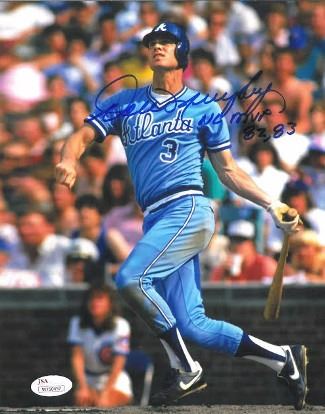 Dale Murphy played for the Atlanta Braves and won consecutive National League Most Valuable Player Awards in 1982 and 1983. He also won the National League's Silver Slugger Award four straight years (1982-1985), and the National League's Gold Glove award five straight years (1982-1986). Dale has hand autographed this Atlanta Braves 8x10 Photo with NL MVP 82, 83 inscription. JSA Hologram and Certificate of Authenticity is included.