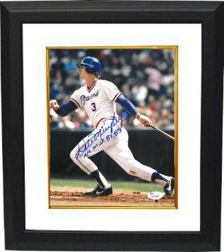 Dale Murphy played for the Atlanta Braves and won consecutive National League Most Valuable Player Awards in 1982 and 1983. He also won the National League's Silver Slugger Award four straight years (1982-1985), and the National League's Gold Glove award five straight years (1982-1986). Dale has hand autographed this Atlanta Braves 8x10 Photo with NL MVP 82, 83 inscription. JSA Hologram and Certificate of Authenticity is included. Custom White Mat and Black Color Framed as shown.