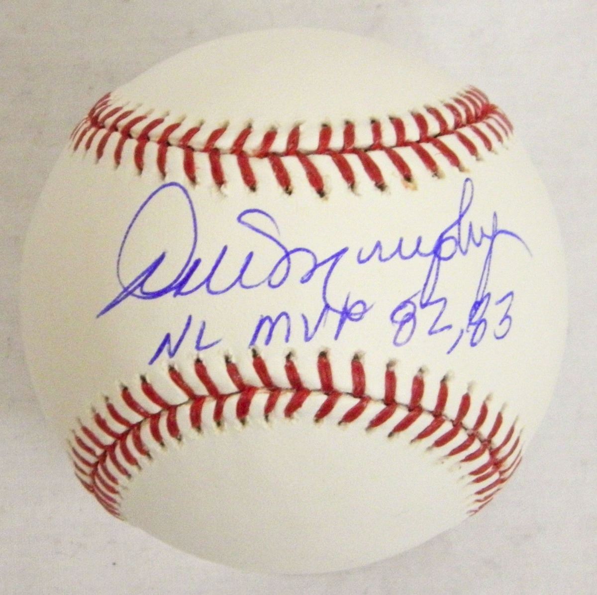 Dale Murphy signed Rawlings official MLB baseball with 'NL MVP 82, 83' inscription. Item comes with a Schwartz Sports Memorabilia tamper-proof numbered hologram and Certificate of Authenticity which can be verified online.