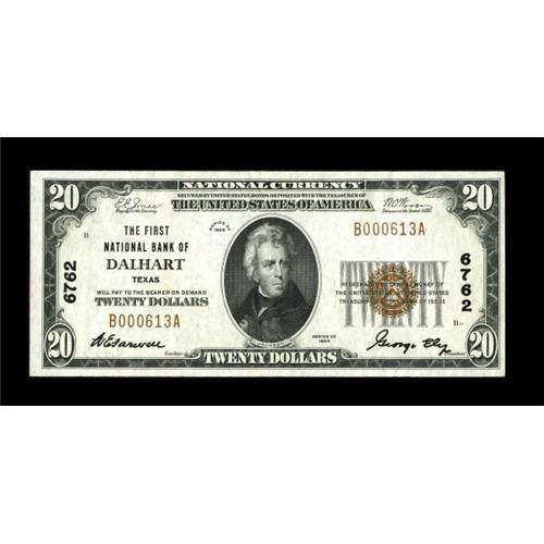 <B>Dalhart, TX</B></I> - $20 1929 Ty. 1 <B>The First NB</B></I> Ch. # 6762<BR> This ex-Irish collection piece is easily the finest reported Series 1929 example from this sought after panhandle issuer. Bright <B>Extremely Fine+</B></I>.<BR><BR><b>Shipping:</b> Coins & Currency (<a target="_blank" href="http://www.heritageauctions.com/common/shipping.php">view shipping information</a>)
