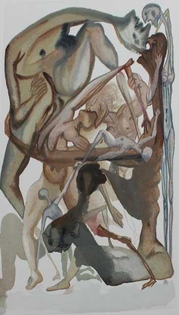 This is an original Dali print from the Divine Comedy. ...so that in the second circle hypocrites, flatterers, sorcerers, plagiarists, thieves, simonists, panderers, jobbers and filthy trash like that are chained. * * Artist: Salvador Dali Title: On the Edge of the 7th CircleSeries: Canto 11 of InfernoMedium: Wood block print on paperPaper size: 13 x 10.25 inches Image size: 10 x 7 inchesCertification: Bruce Hochman signed appraisal