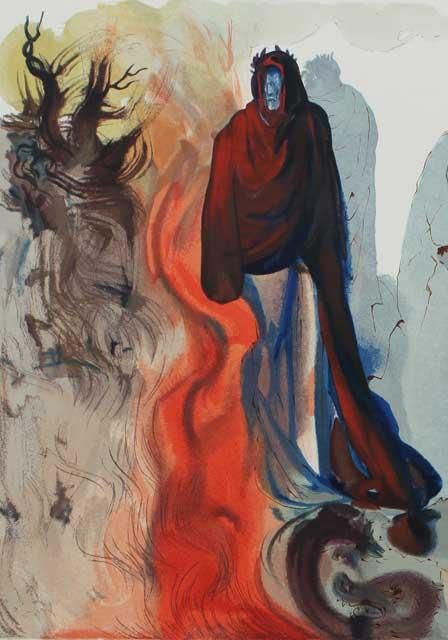 This is an original Dali print from the Divine Comedy. The Emperor of the woeful kingdom rose forth, his chest breaking through the ice. * Artist: Salvador Dali Title: The Apparition of Dis Series: Canto 34 of InfernoMedium: Wood block print on paperPaper size: 13 x 10.25 inches Image size: 10 x 7 inchesCertification: Bruce Hochman signed appraisal