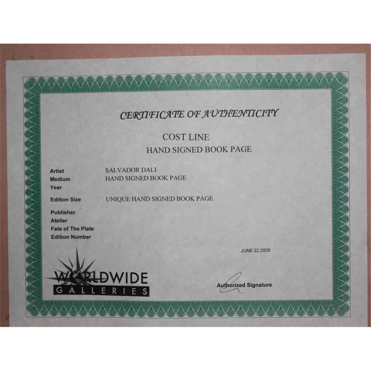 Salvador Dali - "Cost Line" - Hand Signed By Salvador Dali - Book Plate - Professionally Framed And Matted - Mint Condition - Image Size 7" X 5" - Framed Size Appx 20.5" X 18" - Comes With Certificate Of Authenticity