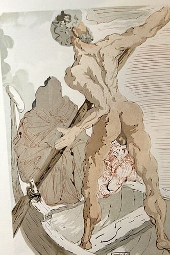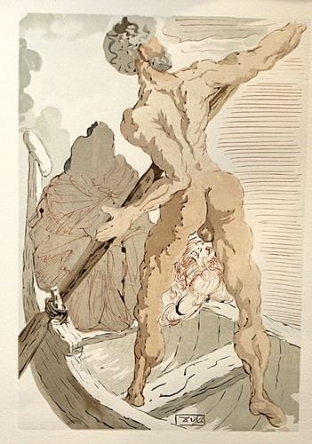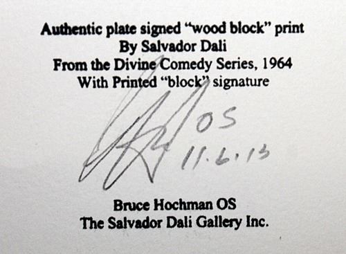 Authentic plate signed wood block print by Salvador Dali from the Divine Comedy Series. The Divine Comedy suite consists of 100 color wood engravings created between 1960 and 1964 after 100 watercolors painted by Salvador Dali between 1951 and 1960. At the height of his fame in 1957, more than a century after William Blake had done the same, Salvador Dalí began working on the series of 100 paintings based on Dante’s epic poem The Divine Comedy.