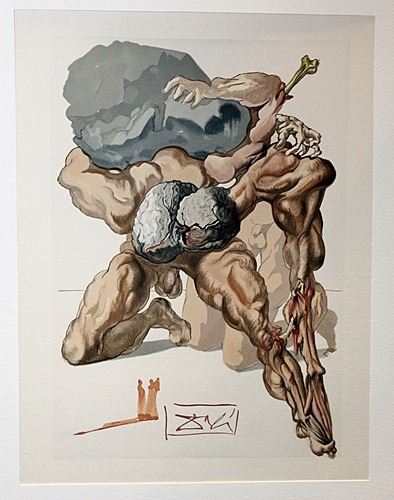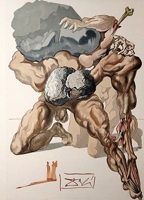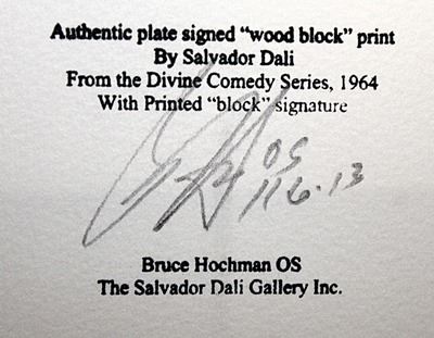 Authentic plate signed wood block print by Salvador Dali from the Divine Comedy Series. The Divine Comedy suite consists of 100 color wood engravings created between 1960 and 1964 after 100 watercolors painted by Salvador Dali between 1951 and 1960. At the height of his fame in 1957, more than a century after William Blake had done the same, Salvador Dalí began working on the series of 100 paintings based on Dante’s epic poem The Divine Comedy.