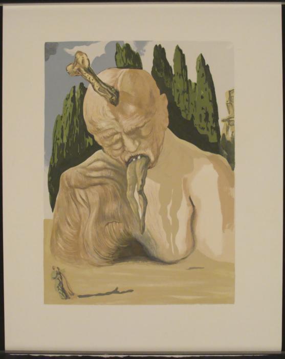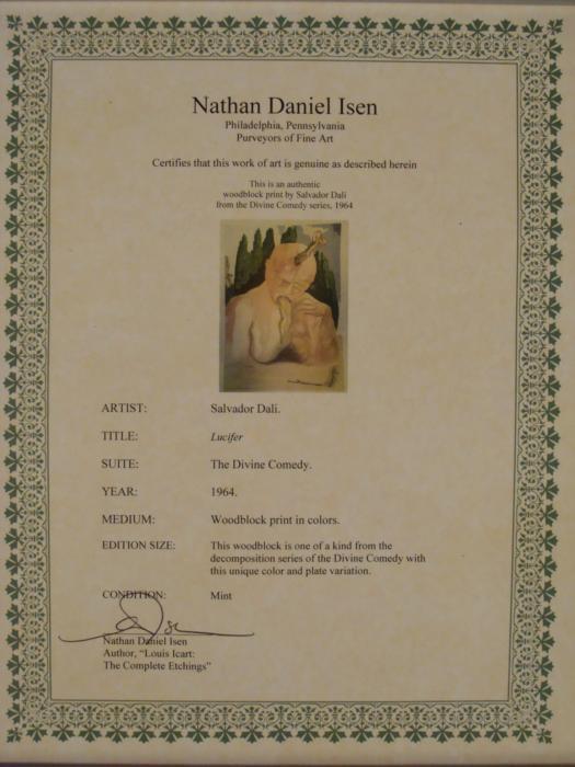 This Dali woodblock print is a one of a kind decomposition from his interpretation of Dante's Divine Comedy. * Dali spent 13 years of his life to complete the Divine Comedy, which included 101 watercolors. Soon afterward, Dali supervised his engraver Raymond Jaquet in the creation of over 3,000 wood engravings to produce a limited run of portfolios. The wood engravings were immediately destroyed after the run was complete. The process of separating the colors is called "decomposition," and a special edition of these was created, depicting the print in different stages of production. * Artist: Salvador Dali Title: Lucifer Suite: The Divine Comedy Year: 1964 Medium: Woodblock print in colors Condition: Mint (has been stored rolled) Certificate of Authenticity: From Nathan Daniel Isen of Philadelphia Although it is not considered a finished print, this decomposition is unique in its color and plate variation, and is deemed more rare and desirable to the collector. The Divine Comedy is considered one of Dali's most passionate series, and this image portrays the dark side of the human condition. *
