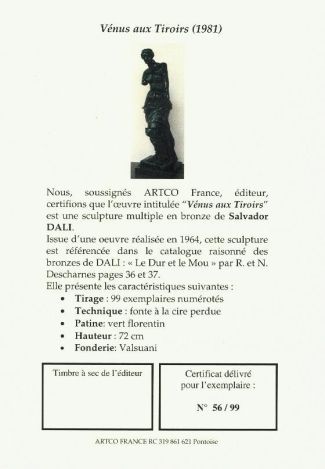 Salvador Dali "Venus Aux Tiroirs Gigantique" Original Limited Edition Bronze - Created In 1981 During Salvador Dali's Lifetime - Comes With Certificate Of Authenticity From Artco France - Numbered 56/99 - 72 Cm