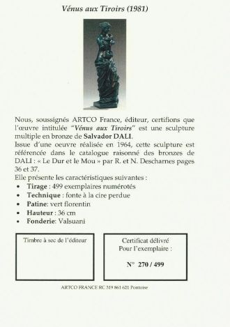 Salvador Dali "Venus Aux Tiroirs" Original Limited Edition Bronze - Created In 1981 During Salvador Dali's Lifetime - Comes With Certificate Of Authenticity From Artco France - Numbered 270/499 - 36 Cm