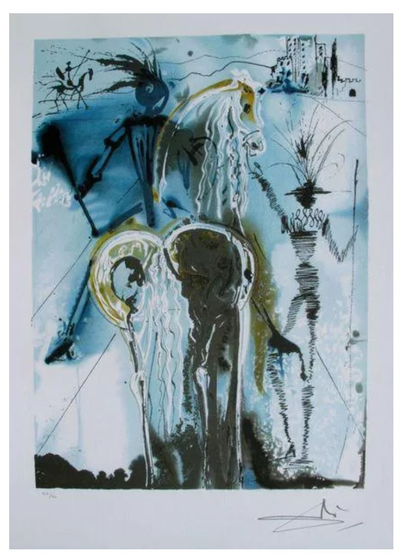 This is a Salvador Dali lithograph titled "Don Quixote". Made on archival quality paper, facsimile pencil signed, numbered from an edition of 500. Measures 19 inches x 28.5 inches on 22 inches x 33 inches paper. Comes unframed. Comes with a certificate of authenticity.