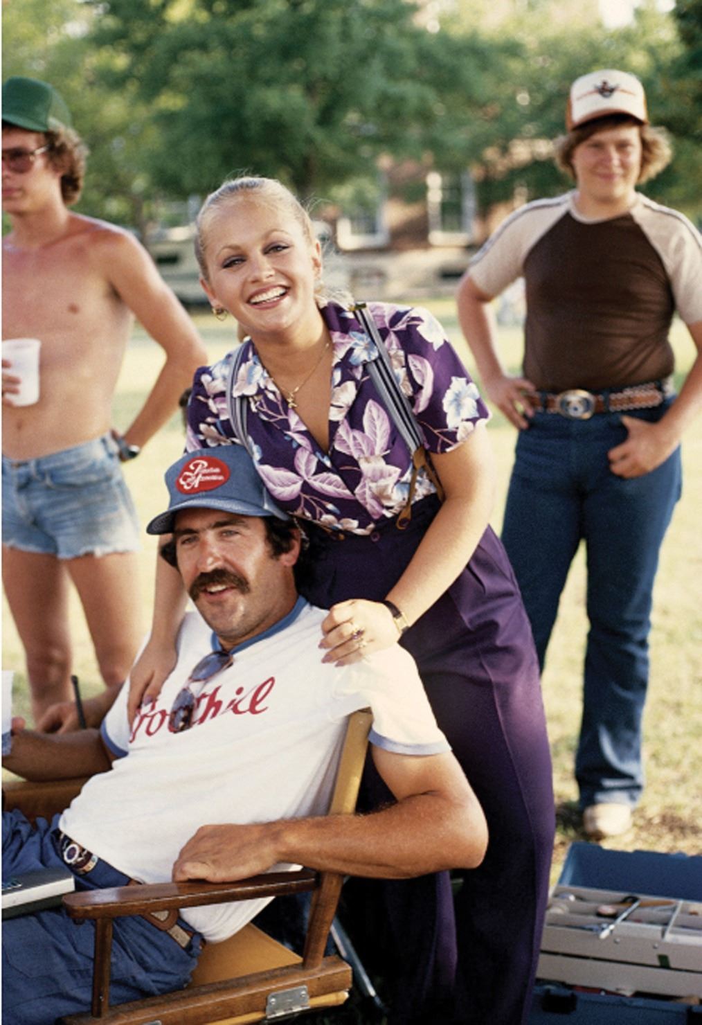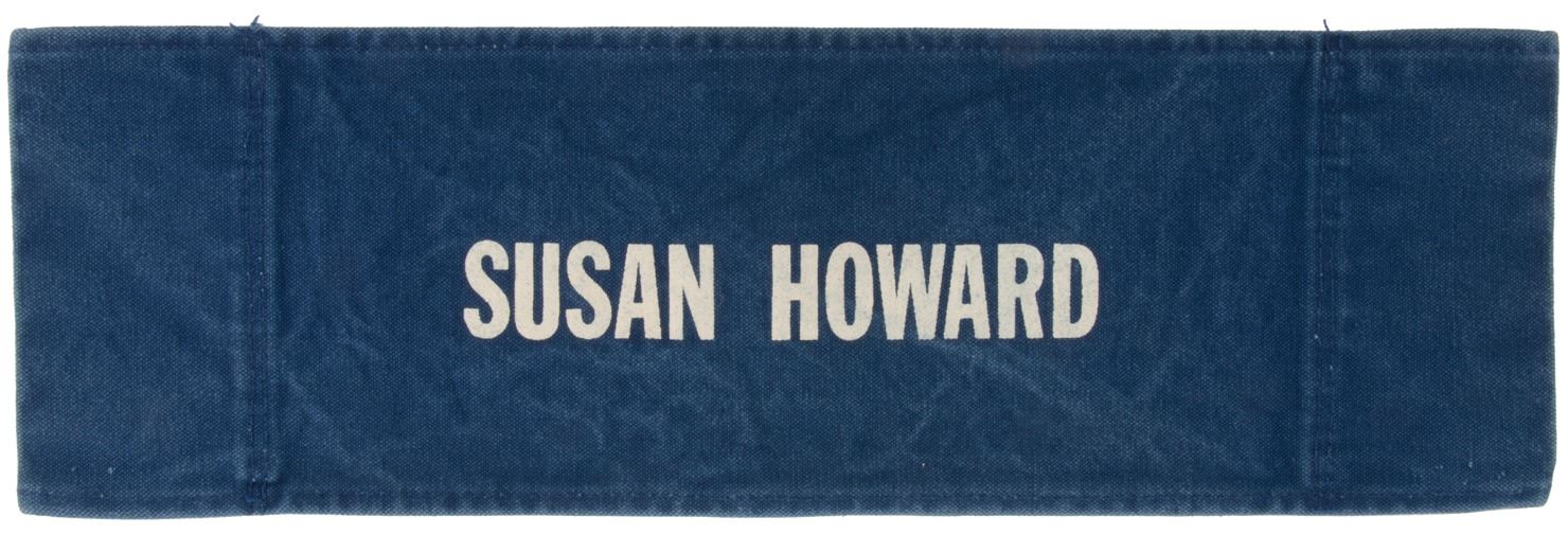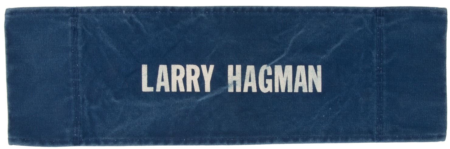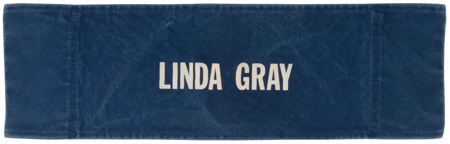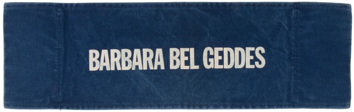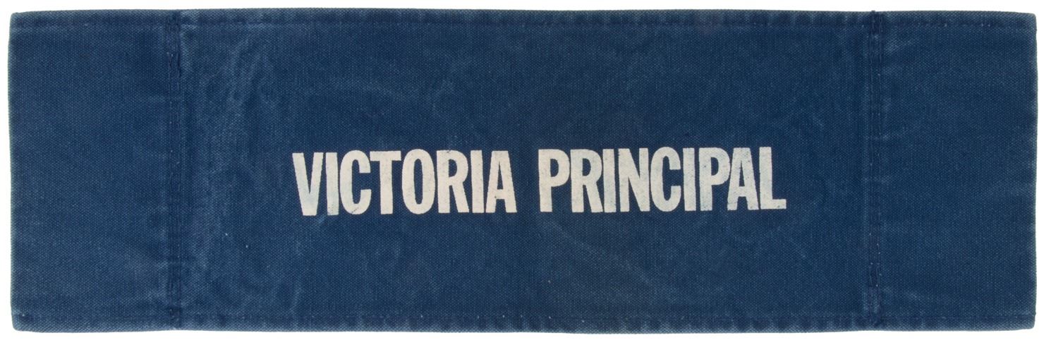 151. Dallas (11) cast on-set director's chair backs. (CBS TV, 1978-1991) Vintage original collection of (11) custom made on-set castmember blue denim director's chair-backs. Chair backs measure 20.25 x 6.5 in. with white printed cast names including Steve Kanaly, Larry Hagman, Linda Gray, Charlene Tilton, Patrick Duffy, Barbara Bel Geddes, Victoria Principal, Jim Davis, Susan Howard, Ken Kercheval, and Howard Keel. Exhibiting production wear and some age. In vintage very good to fine condition. Originally an exhibit in the Dallas Traveling Museum. $1,500 - $2,500