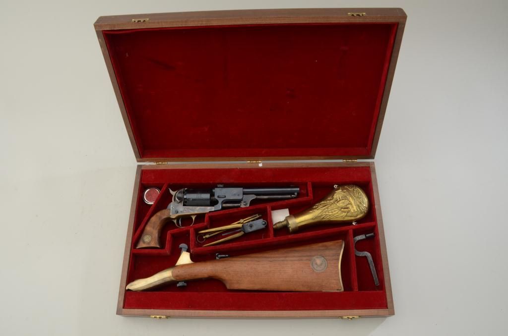 Dallas Arms Collector’s Association Special Edition modern reproduction of a Colt Third Model Dragoon percussion revolver, .44 cal., 7-1/2” barrel, blue and case hardened finish, wood medallion grips, #DAC 41, in woodpresentation case with reproduction shoulder stock, combination nipple wrench/screwdriver, brass powder flask, bullet mold, capping tool and cap tin. The gun is in overall like new condition as are the accessories. Est.: $600-$1,200.